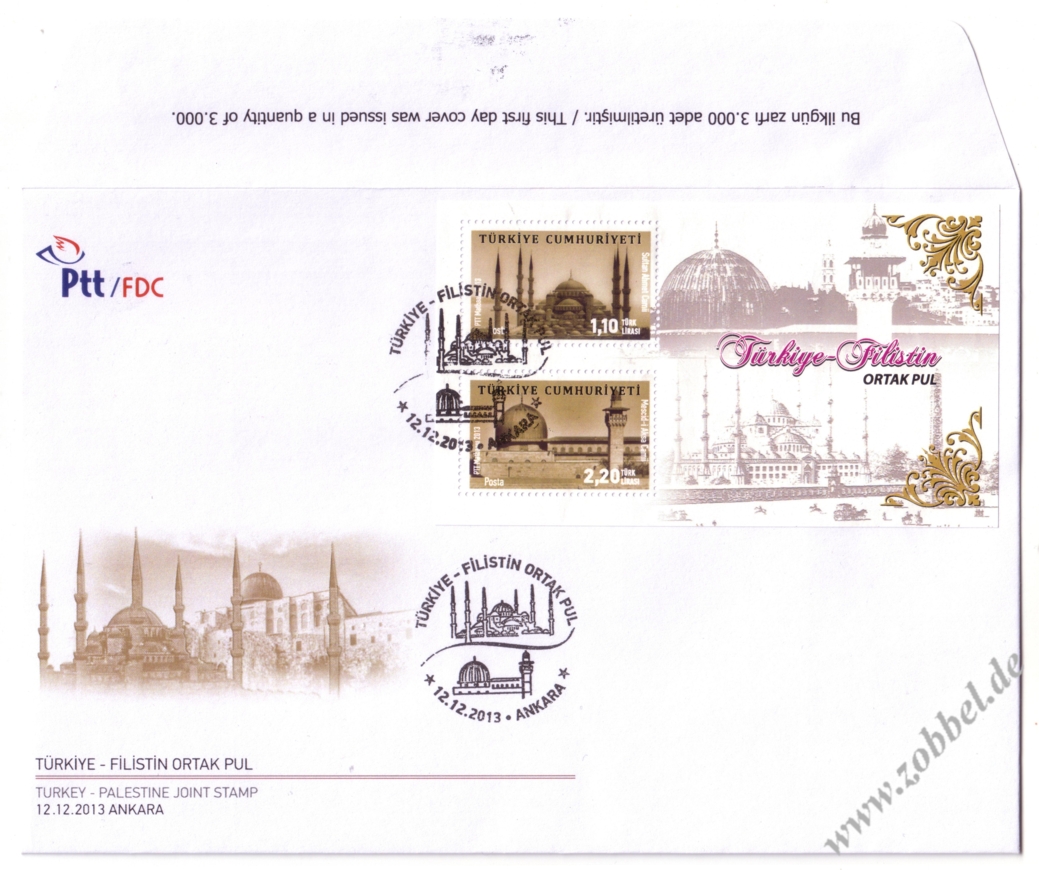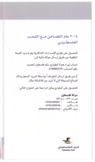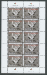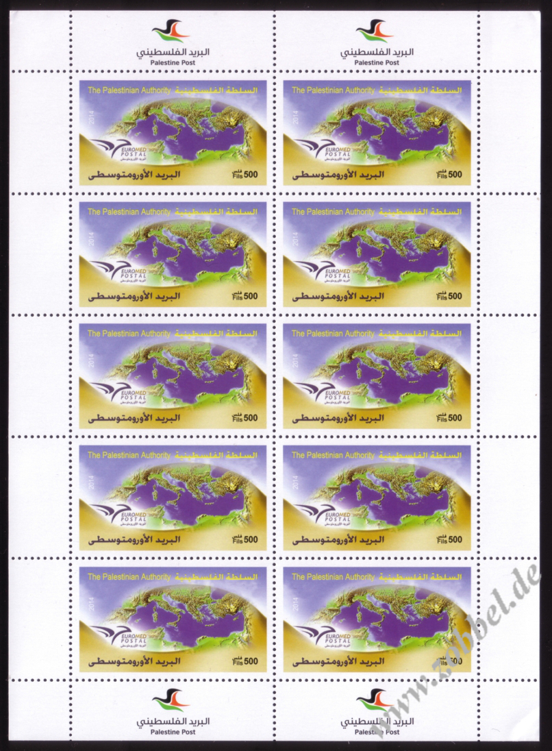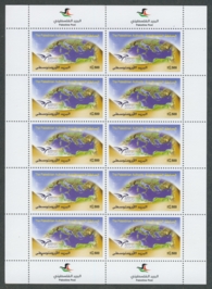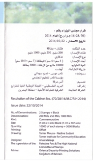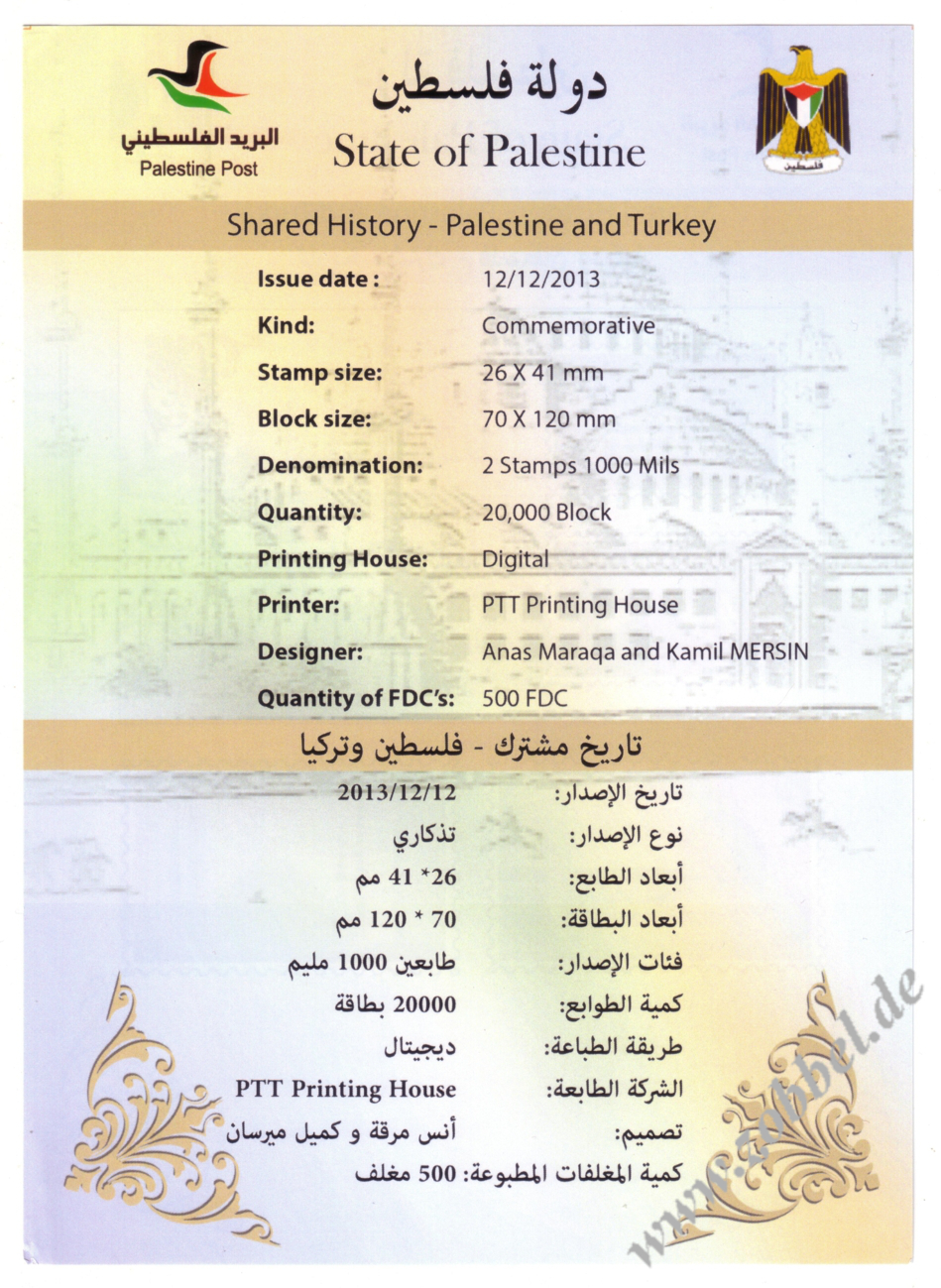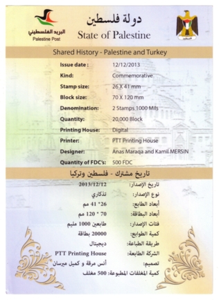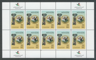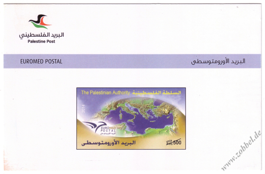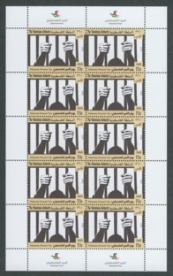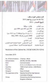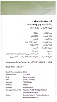 According to reports, Palestine Post has released in December 2014 a stamp series on the topic of "2014 - International Year of Solidarity with the Palestinian People" conisting of two stamps and one block. Issue day is 29.11.2014, the International Day of Solidarity with the Palestinian People. The issue was designed by Yasser Majdi Al-Khaldi (an archicture student and artist at AUC Cairo). Denominations are: 200 and 420 Mils (stamps), and 1,800 Mils (block). Printed by Oriental Security Printing Solution, Bahrain in sheets of 10 (5x2): 10,000 stamps each and 2,000 blocks.