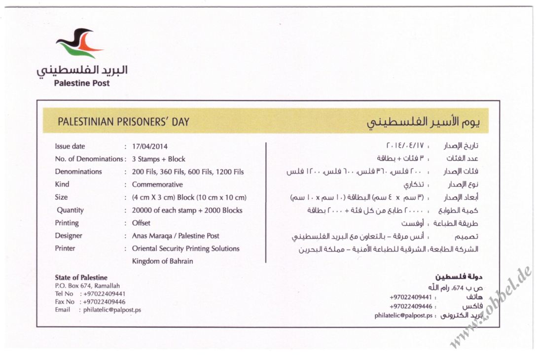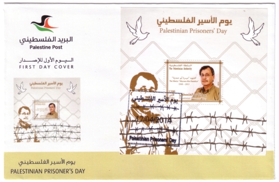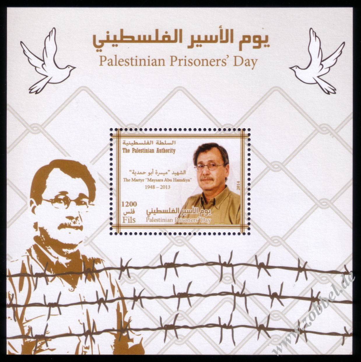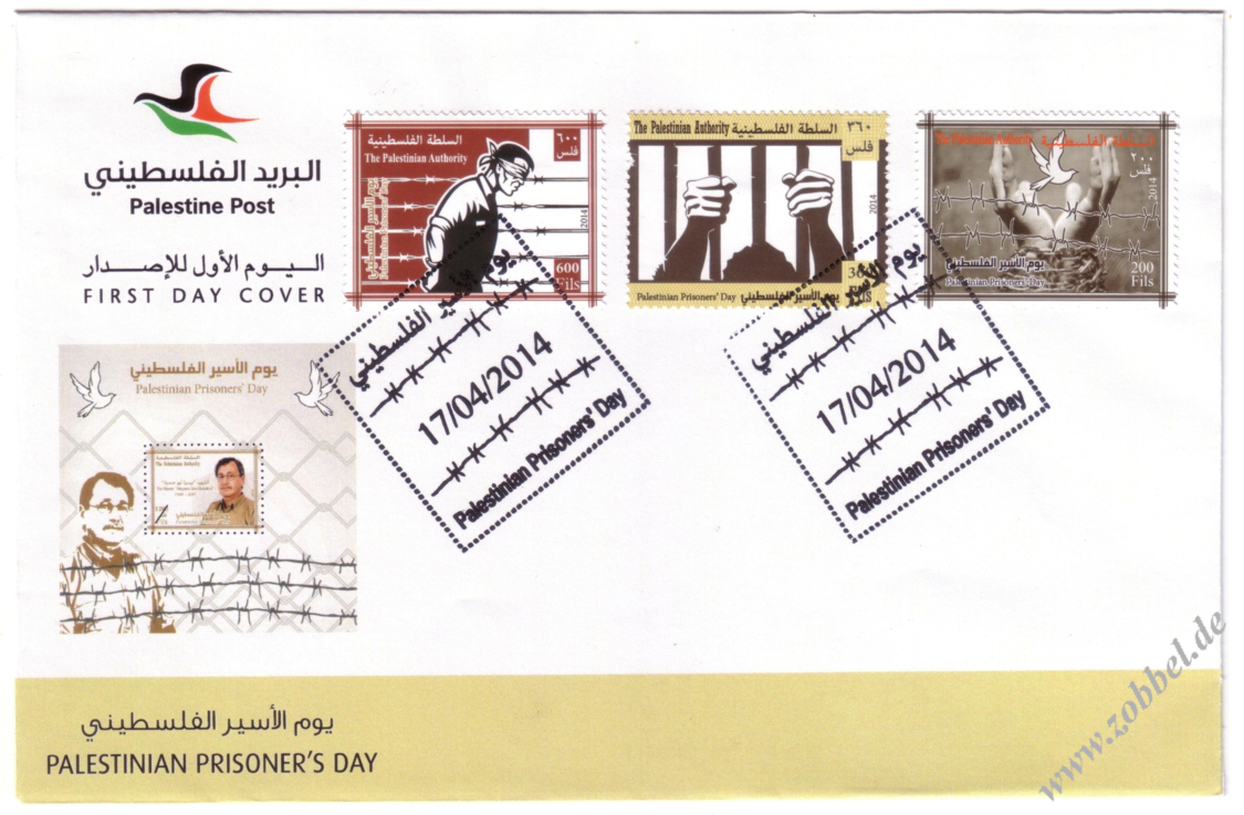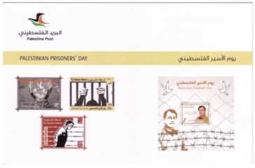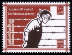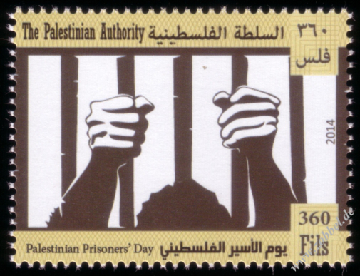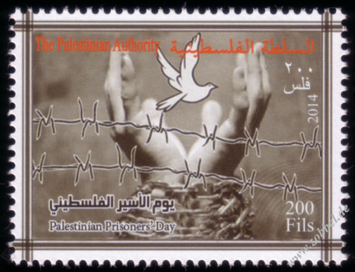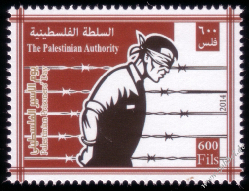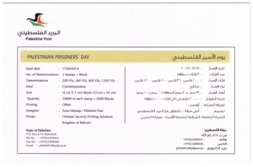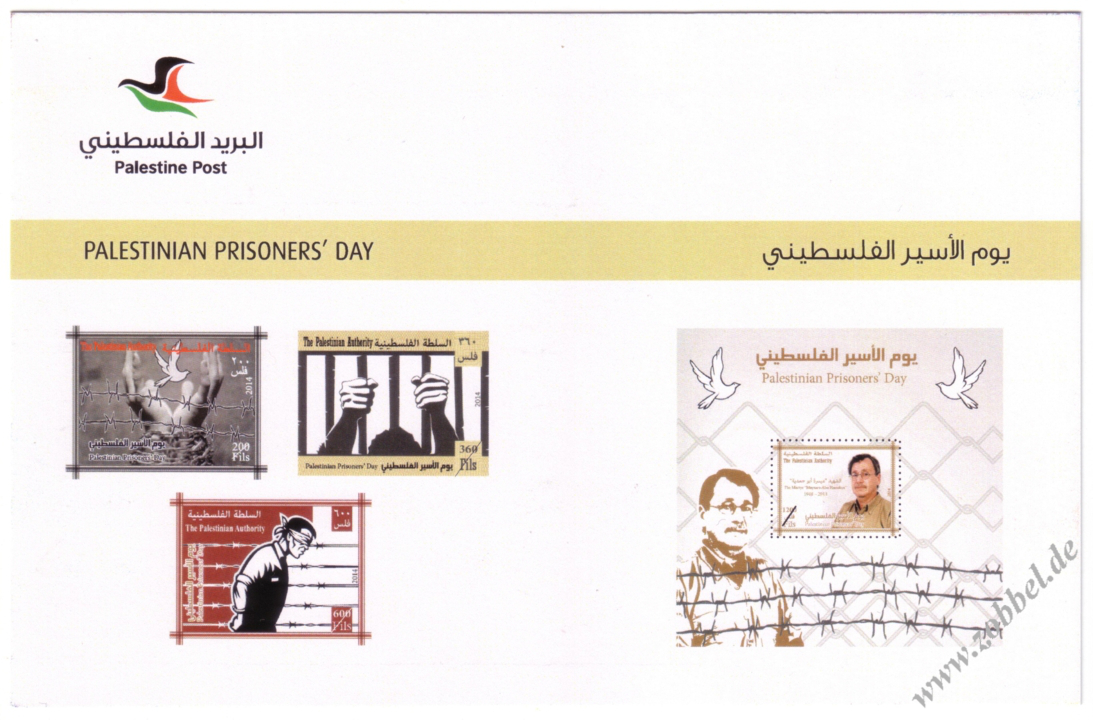 According to reports, Palestine Post has issued a stamp series on "Palestinian Prisoners' Day" (يوم الأسير الفلسطيني) on 17.04.2014. The series consists of three stamps (denominated at 200, 360, 600 Fils) and a block (1,200 Fils) totalling 2,360 Fils in value. Designer: Anas Maraqa. Printed by Oriental Security Printing Solution, Bahrain (offset): 20,000 stamps and 2,000 blocks. Depicted are: