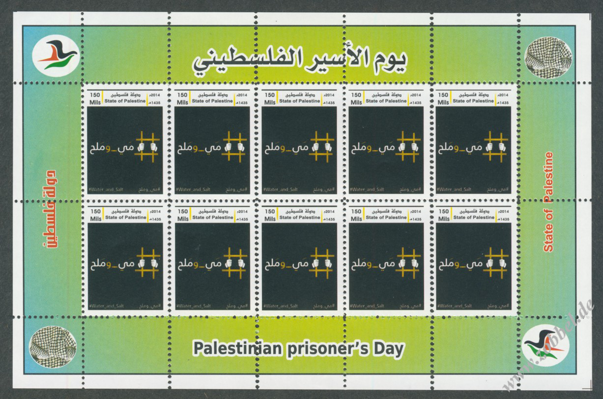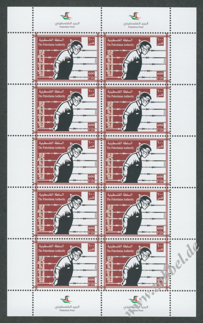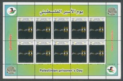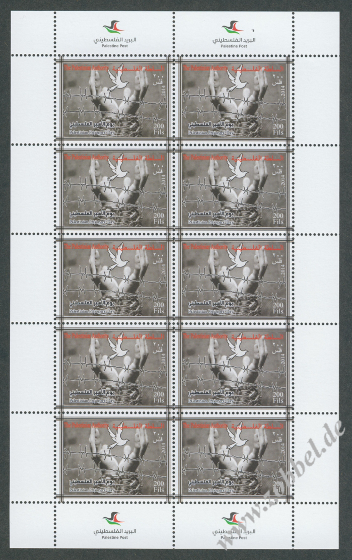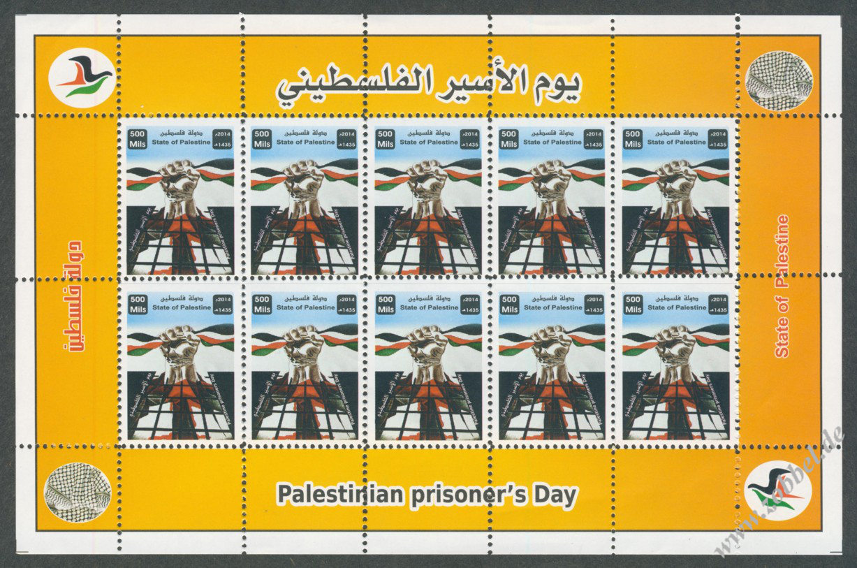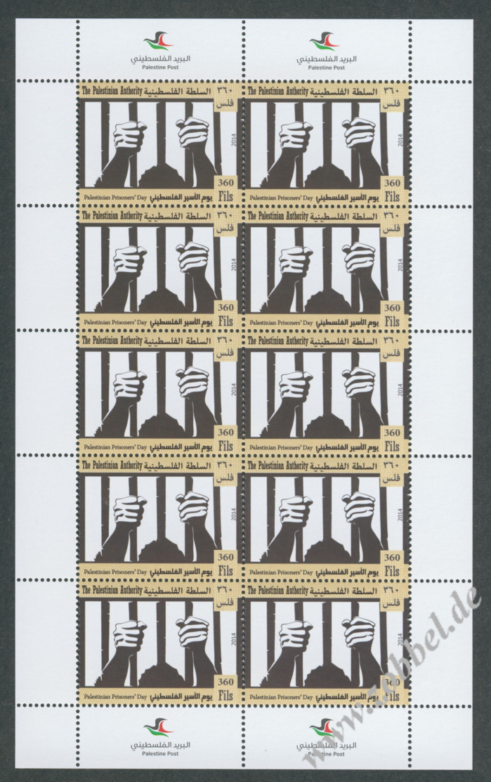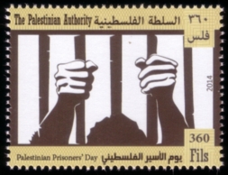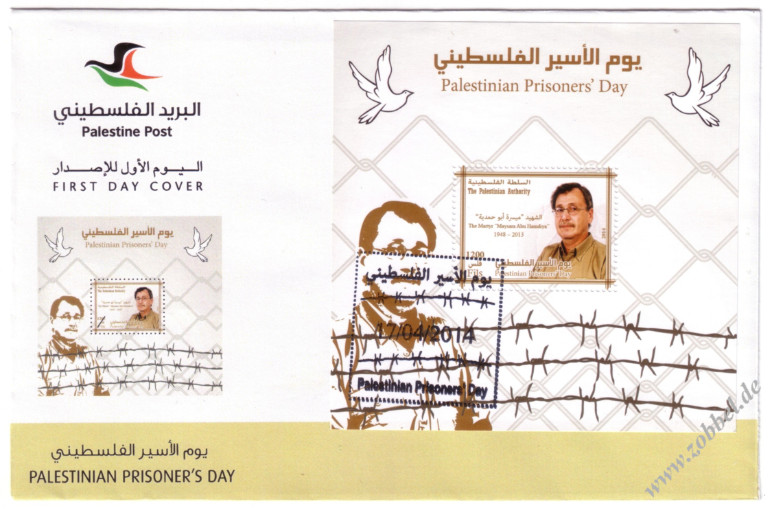 According to reports, Palestine Post has issued a stamp series on "Palestinian Prisoners' Day" (يوم الأسير الفلسطيني) on 17.04.2014. The series consists of three stamps (denominated at 200, 360, 600 Fils) and a block (1,200 Fils) totalling 2,360 Fils in value. Designer: Anas Maraqa. Printed by Oriental Security Printing Solution, Bahrain (offset): 20,000 stamps and 2,000 blocks. Depicted are: