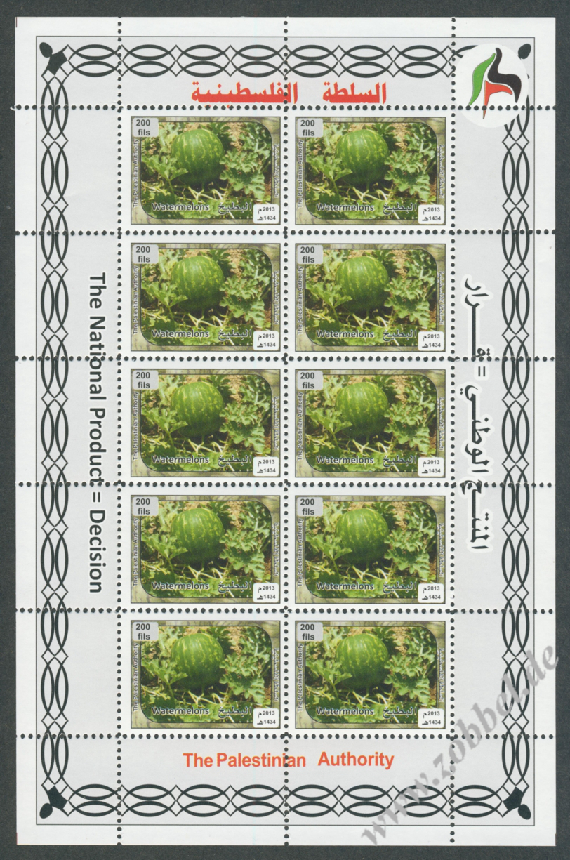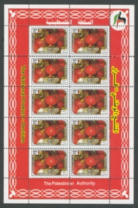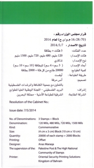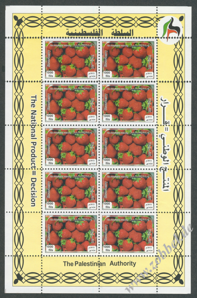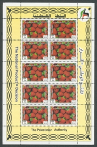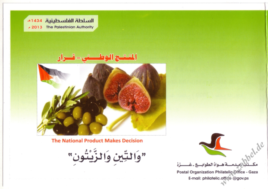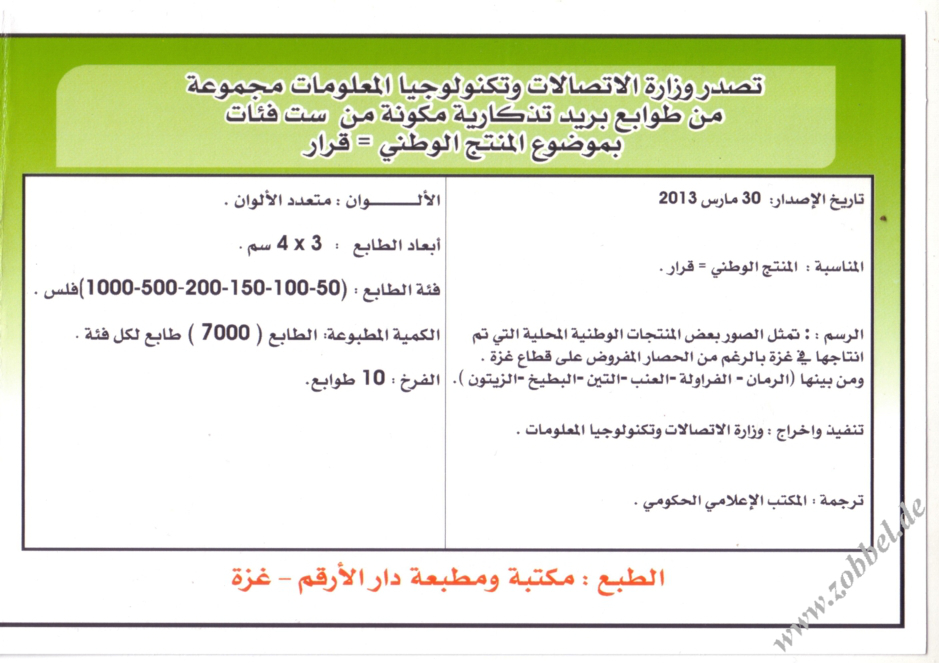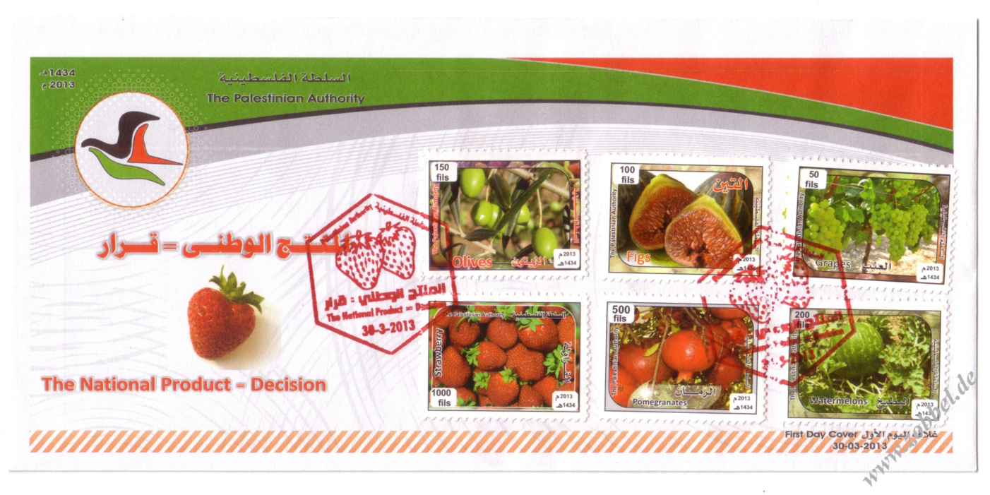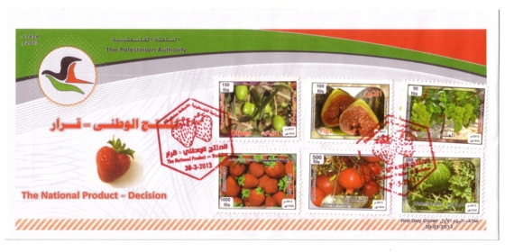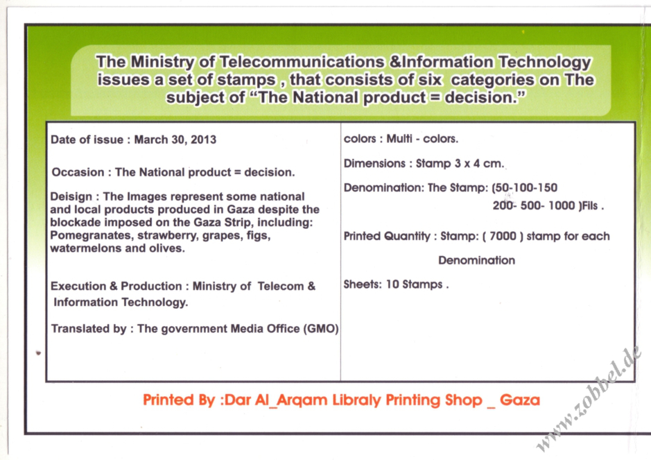 According to reports the Gaza Ministry has issued during March 2014 a set of stamps depicting fruits and vegetables under the title "The National Product = Decision". The six stamps, are denominated at 50, 100, 150, 200, 500, and 1,000 Fils. 7,000 copies each were printed by Dar al-Arqam Library Printing Shop in Gaza in sheets of 10 (2x5). Depicted are: