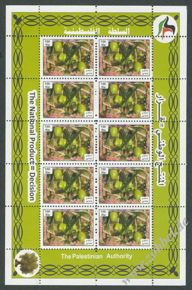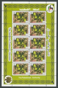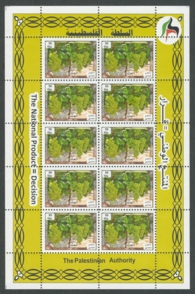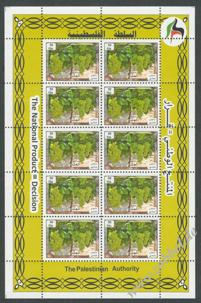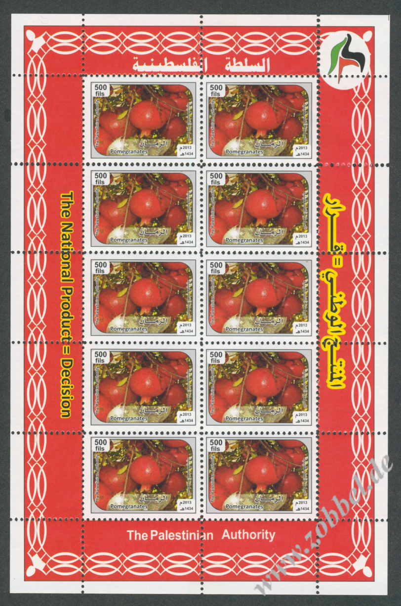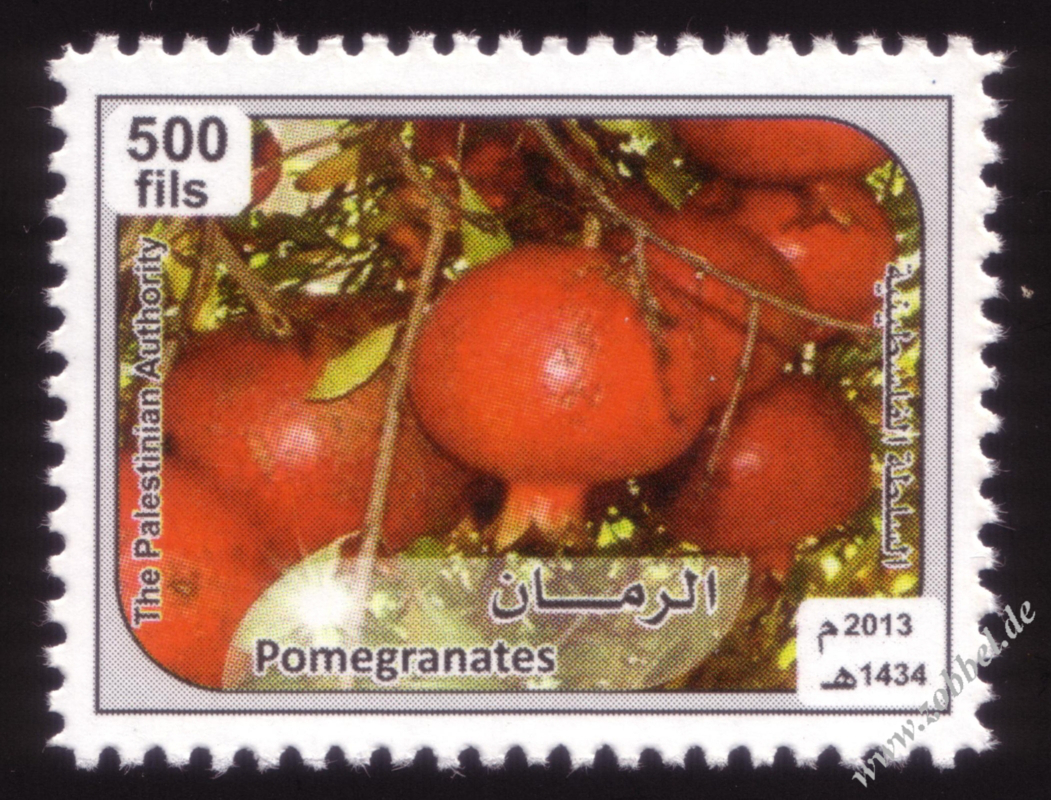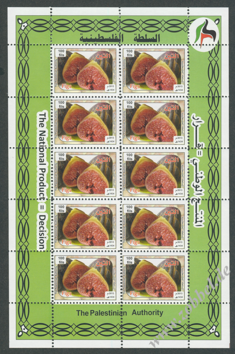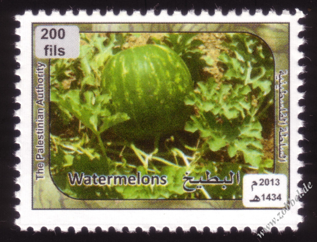 According to reports the Gaza Ministry has issued during March 2014 a set of stamps depicting fruits and vegetables under the title "The National Product = Decision". The six stamps, are denominated at 50, 100, 150, 200, 500, and 1,000 Fils. 7,000 copies each were printed by Dar al-Arqam Library Printing Shop in Gaza in sheets of 10 (2x5). Depicted are: