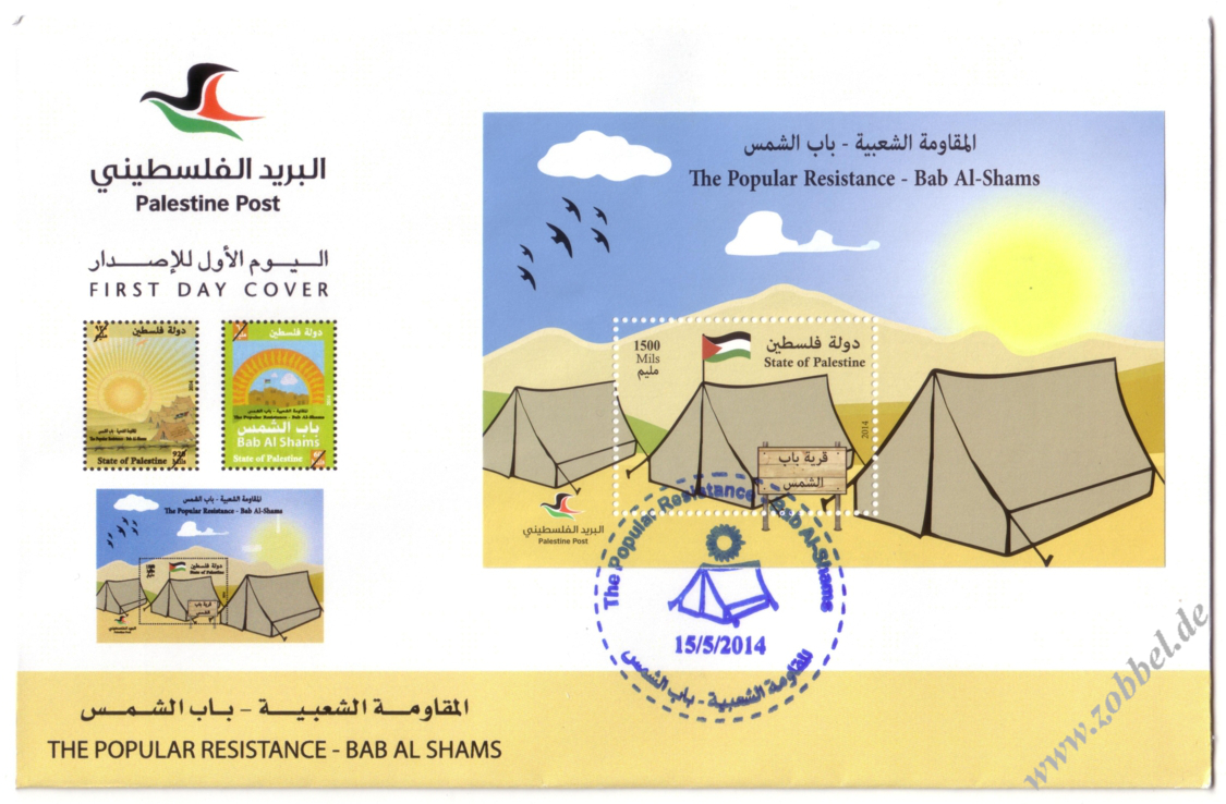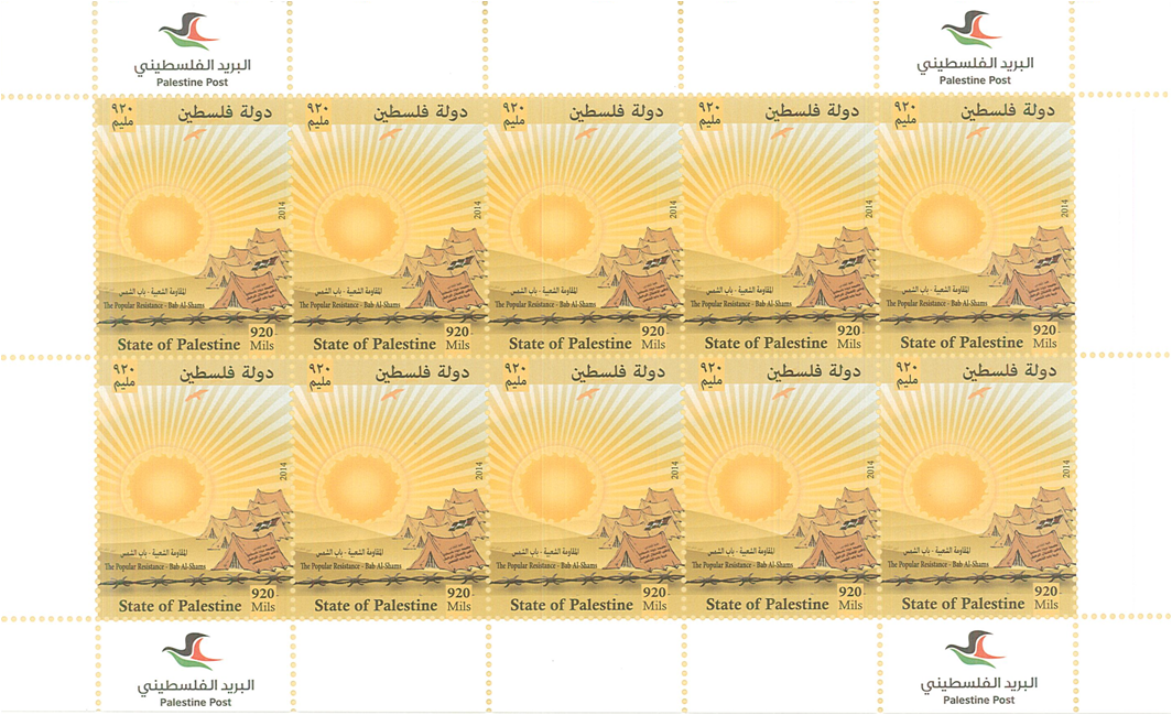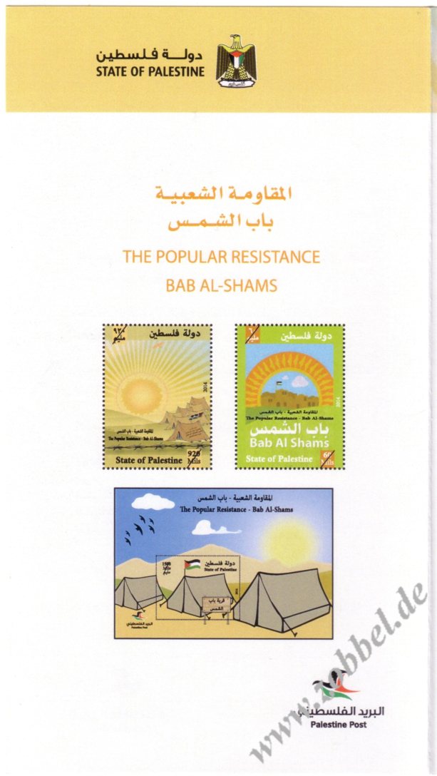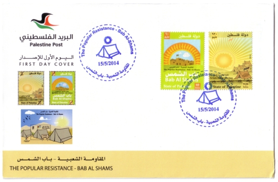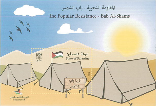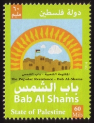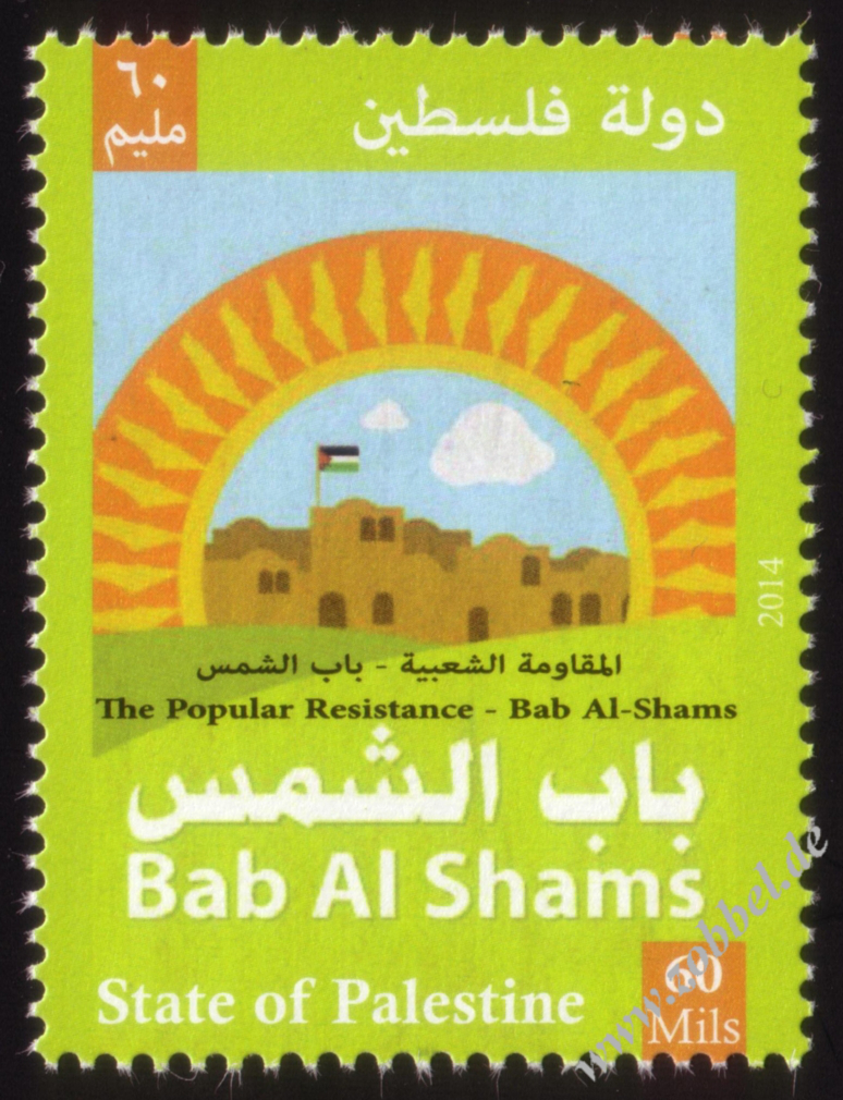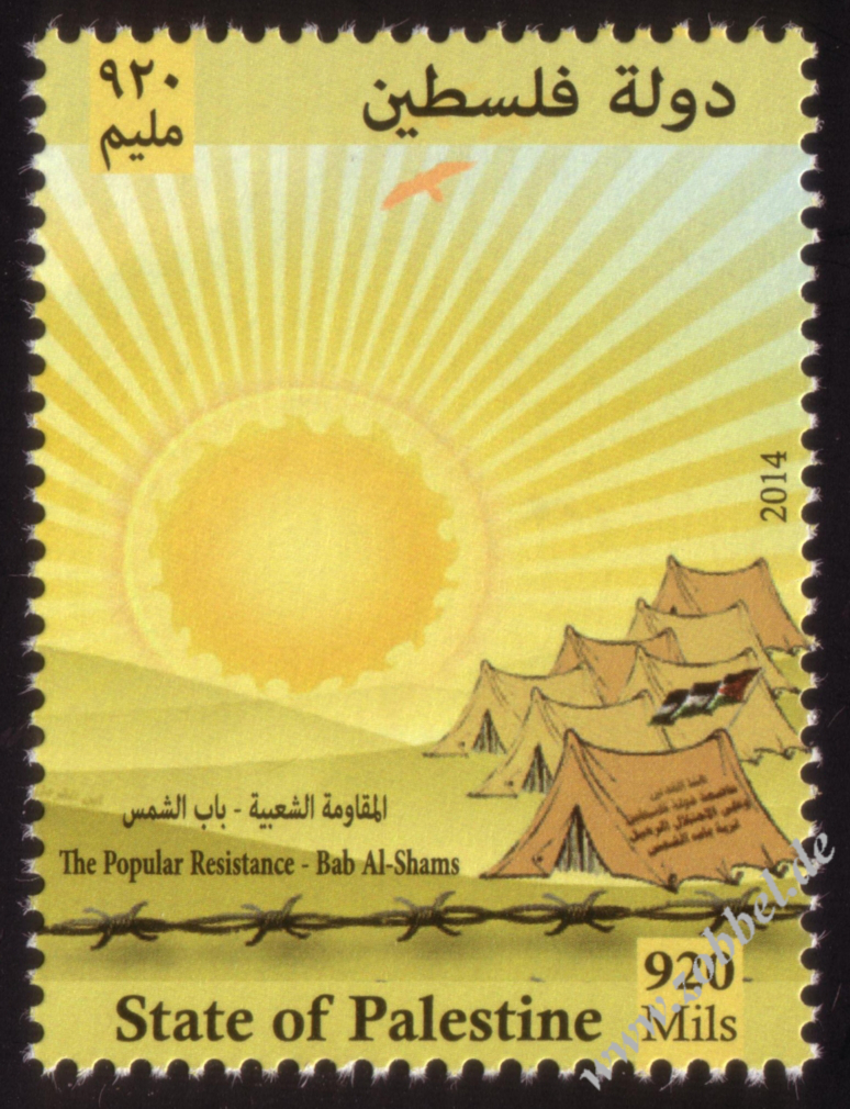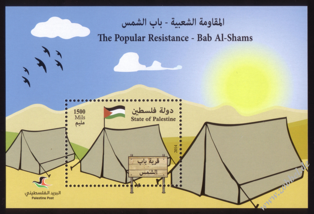 According to reports, Palestine Post has released on 1.09.2014 as stamp series commemorating "The Popular Resistance of Bab al-Shams" conisting of two stamps and one block. Denominations are: 60 and 920 Mils (stamps), and 1,500 Mils (block). Printed by Oriental Security Printing Solution, Bahrain in sheets of 10 (5x2): 10,000 stamps each and 2,000 blocks.