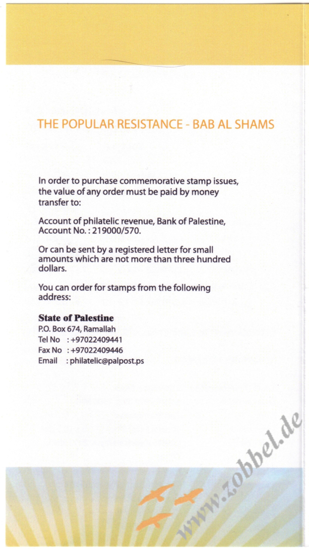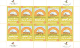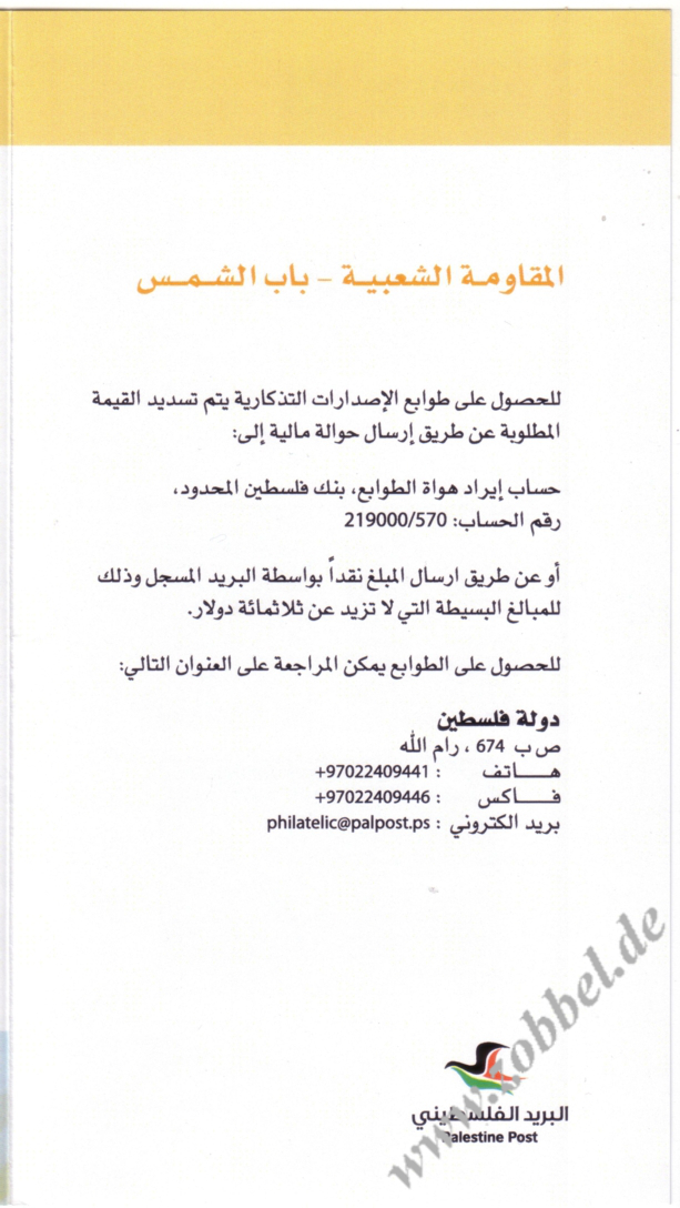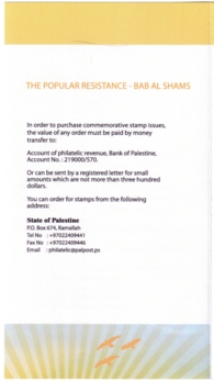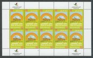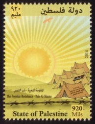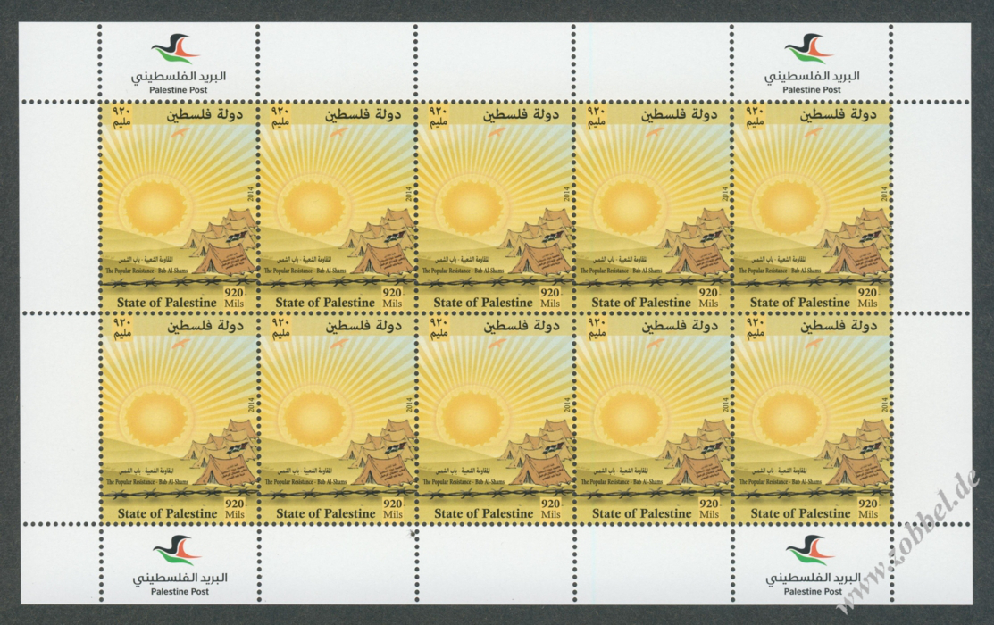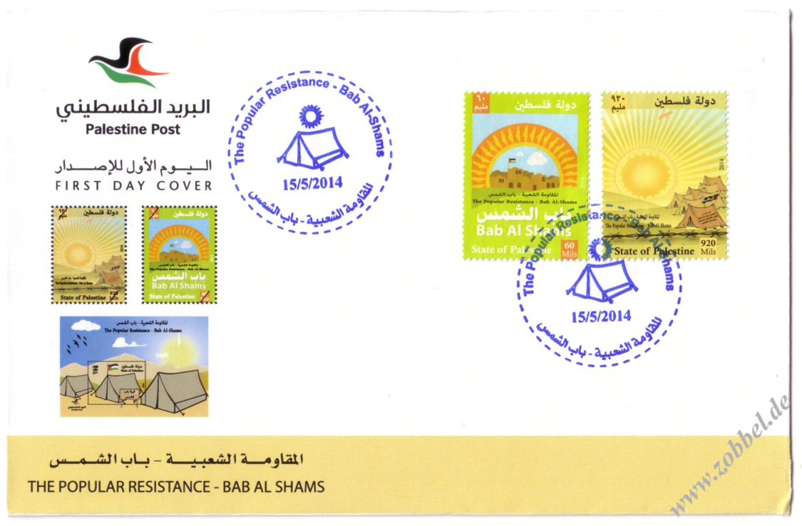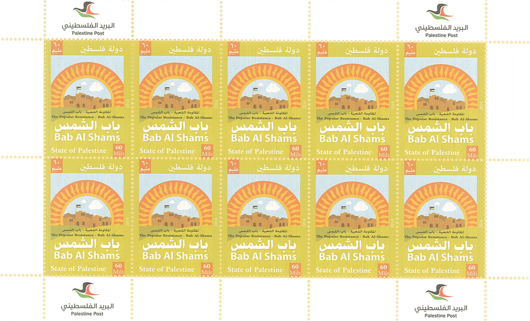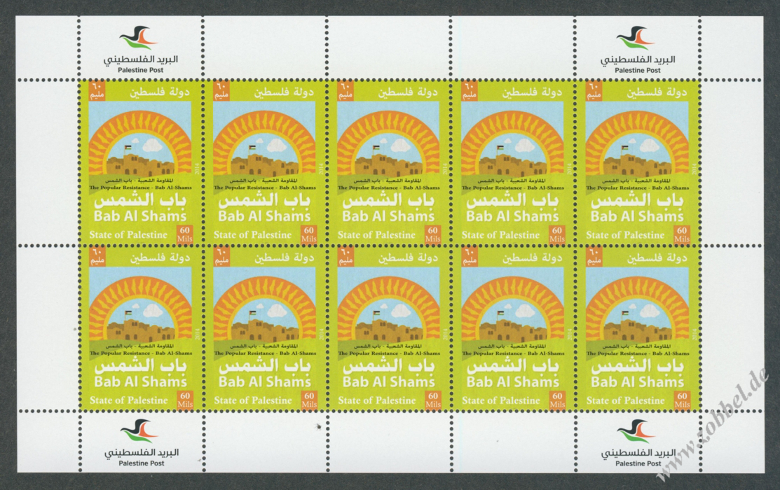 According to reports, Palestine Post has released on 1.09.2014 as stamp series commemorating "The Popular Resistance of Bab al-Shams" conisting of two stamps and one block. Denominations are: 60 and 920 Mils (stamps), and 1,500 Mils (block). Printed by Oriental Security Printing Solution, Bahrain in sheets of 10 (5x2): 10,000 stamps each and 2,000 blocks.