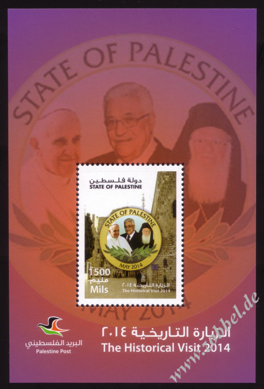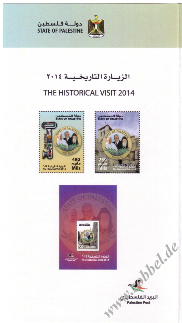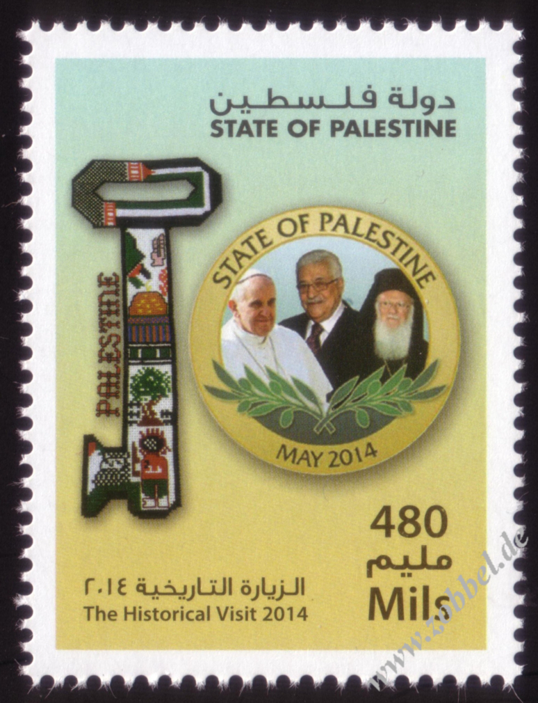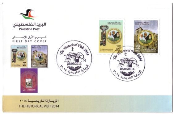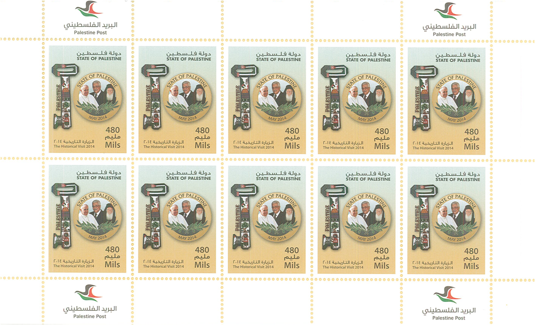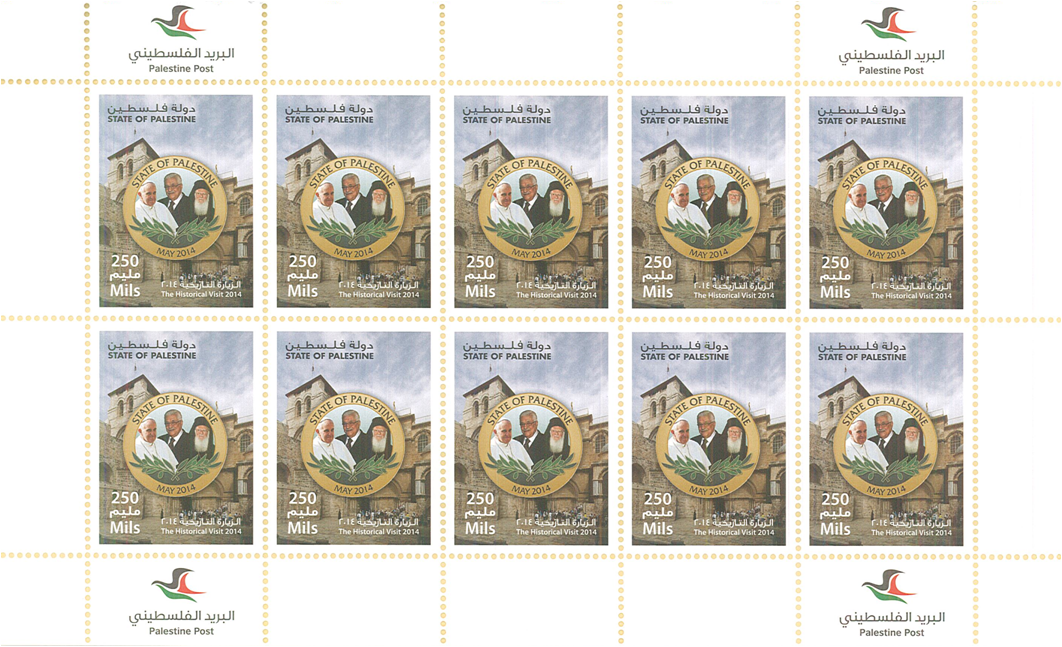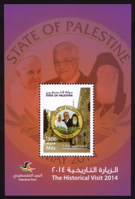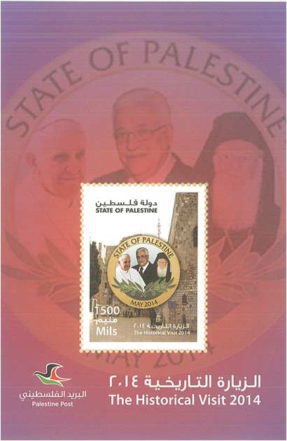 According to reports, Palestine Post plans to commemorate the Pope Francis' Visit to the Holy Land in late May 2014 with a series of stamps. Details remained largely unconfirmed until August. The series was finally issued on 1.09.2014 entitled "Historical Visit 2014" conisting of two stamps and one block. The stamps were designed by Anas Maraqa, Maha Saca, and Taizeer al-Masria. Denominations are: 250 and 480 Mils (stamps), and 1,500 Mils (block). Printed by Oriental Security Printing Solution, Bahrain in sheets of 10 (5x2): 10,000 stamps each and 2,000 blocks. The visit, under the motto "Ut Unum Sint" (or "So that Christians may be one") is officialy described as "Pilgrimage of His Holiness Francis in the Holy Land on the occasion of the 50th anniversary of the meeting in Jerusalem between Pope Paul VI and Patriarch Athenagoras (May 24–26, 2014)". Pope Francis will visit Jordan on 24.05.2014, arrive in Bethlehem in the morning of 25.05.2014, visit various sites (Casa Nova, Church of the Nativity, President's Palace, Phoenix Centre Deheisheh), hold mass in Manger Square, and leave for West Jerusalem and occupied East Jerusalem, as well as Israel, in the afternoon.