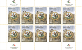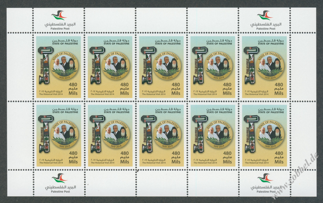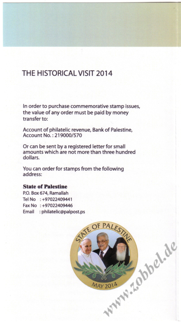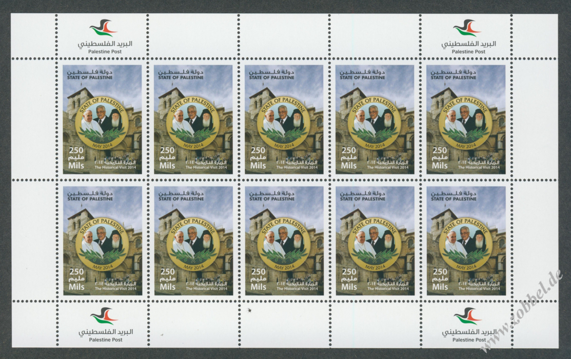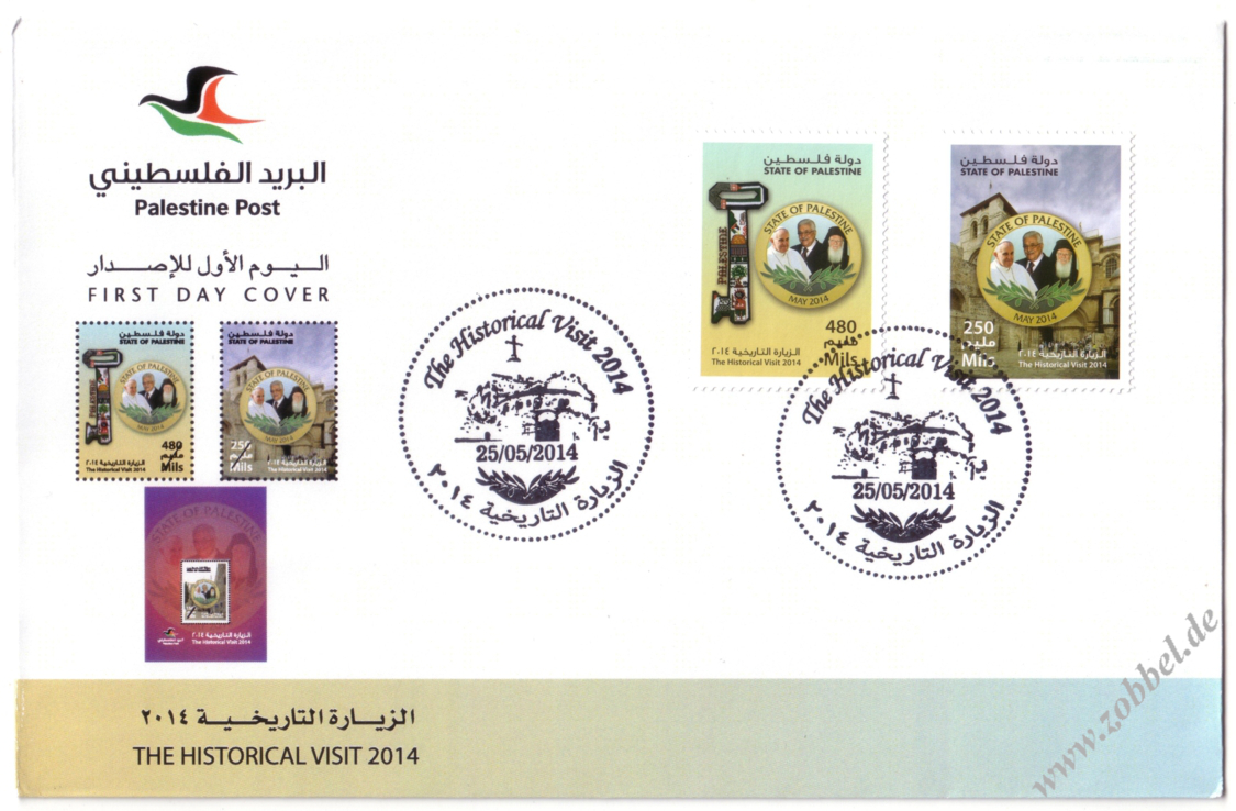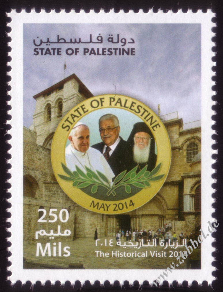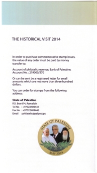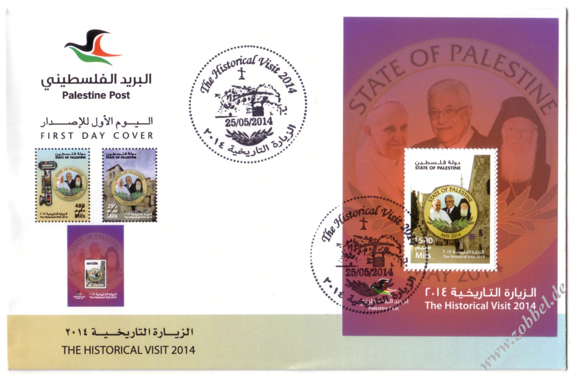 According to reports, Palestine Post plans to commemorate the Pope Francis' Visit to the Holy Land in late May 2014 with a series of stamps. Details remained largely unconfirmed until August. The series was finally issued on 1.09.2014 entitled "Historical Visit 2014" conisting of two stamps and one block. The stamps were designed by Anas Maraqa, Maha Saca, and Taizeer al-Masria. Denominations are: 250 and 480 Mils (stamps), and 1,500 Mils (block). Printed by Oriental Security Printing Solution, Bahrain in sheets of 10 (5x2): 10,000 stamps each and 2,000 blocks. The visit, under the motto "Ut Unum Sint" (or "So that Christians may be one") is officialy described as "Pilgrimage of His Holiness Francis in the Holy Land on the occasion of the 50th anniversary of the meeting in Jerusalem between Pope Paul VI and Patriarch Athenagoras (May 24–26, 2014)". Pope Francis will visit Jordan on 24.05.2014, arrive in Bethlehem in the morning of 25.05.2014, visit various sites (Casa Nova, Church of the Nativity, President's Palace, Phoenix Centre Deheisheh), hold mass in Manger Square, and leave for West Jerusalem and occupied East Jerusalem, as well as Israel, in the afternoon.