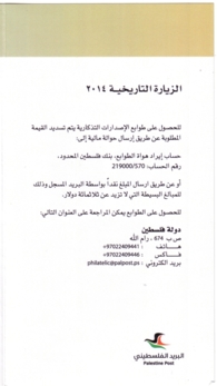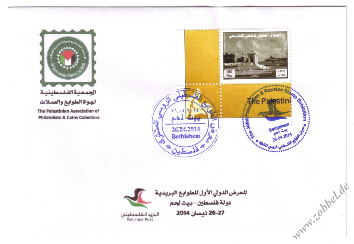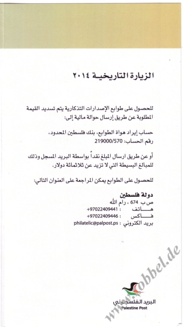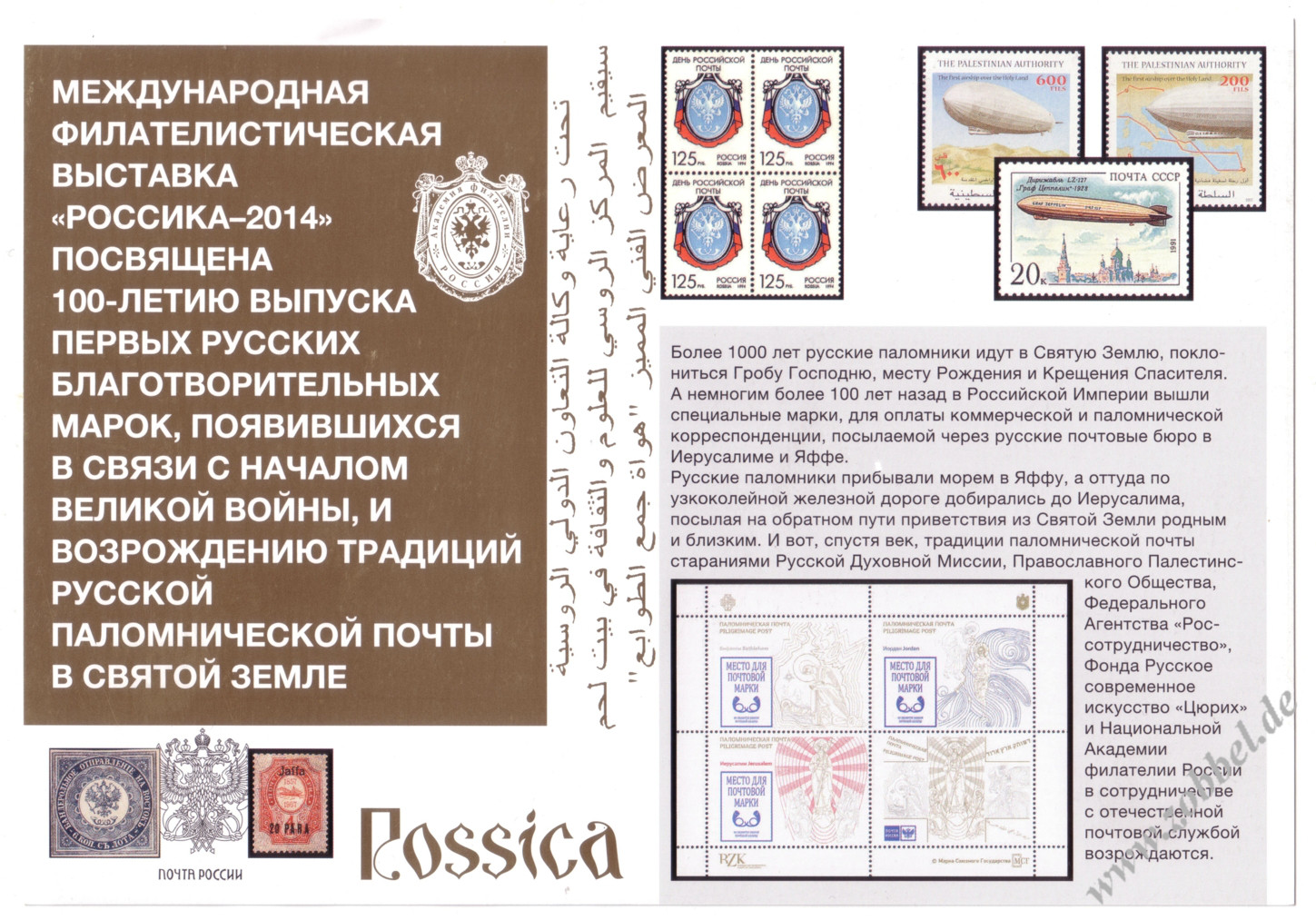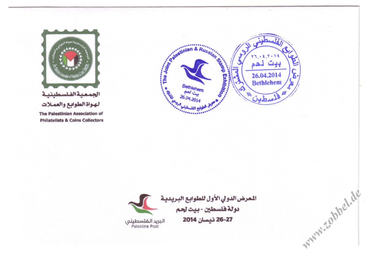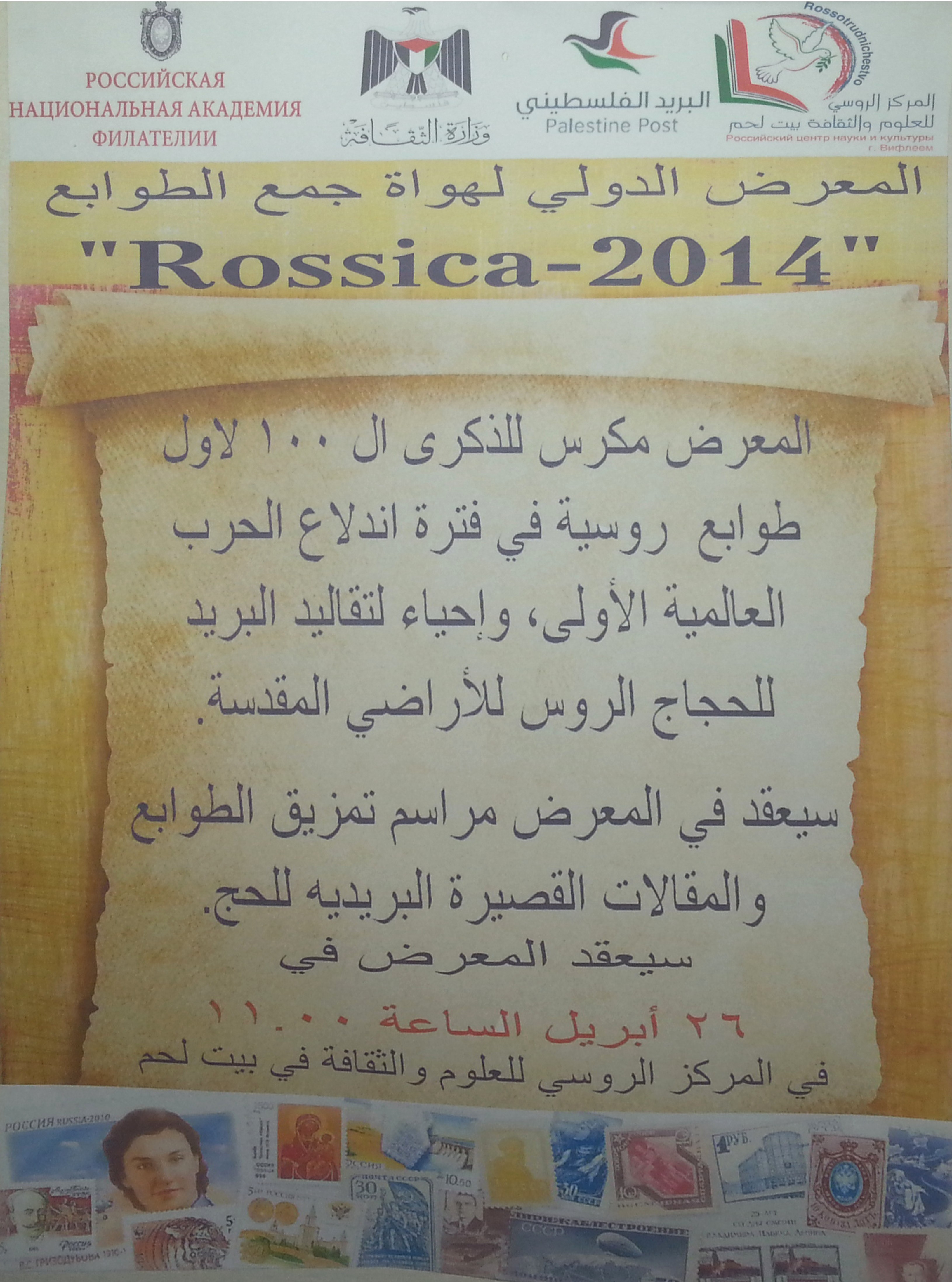 The Fatah government's Palestine Post in Ramallah/al-Bireh has so far issued these series of stamps during 2014, further series are scheduled for later in the year: An exhibition was opened on 26.04.2014 in the Russian Centre of Science and Culture in Bethlehem, part of the ROSSICA 2014 exhibition in Moscow. The Hamas government in Gaza has issued these series of stamps in 2014: