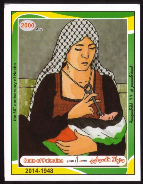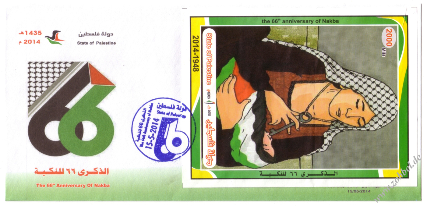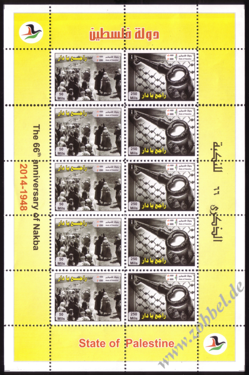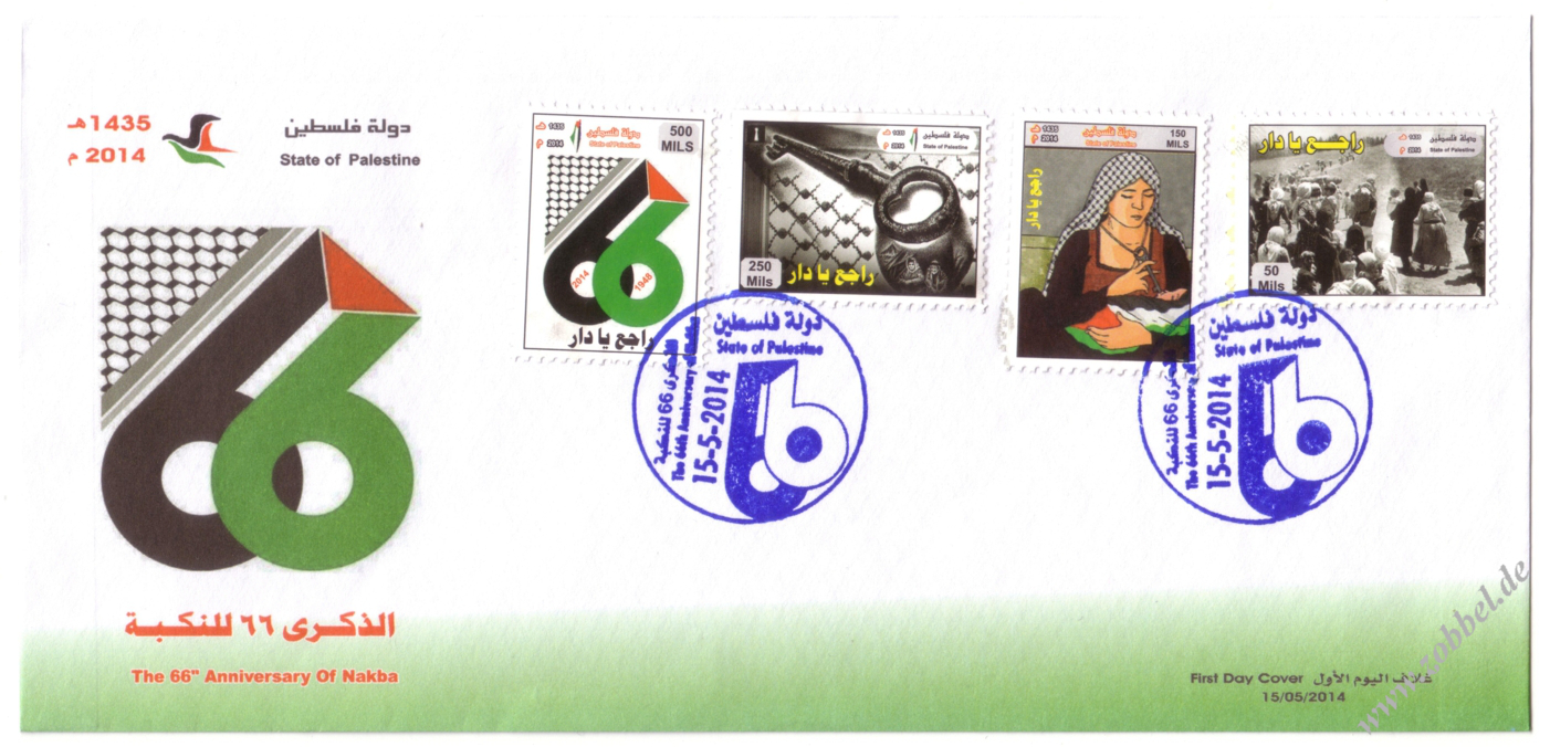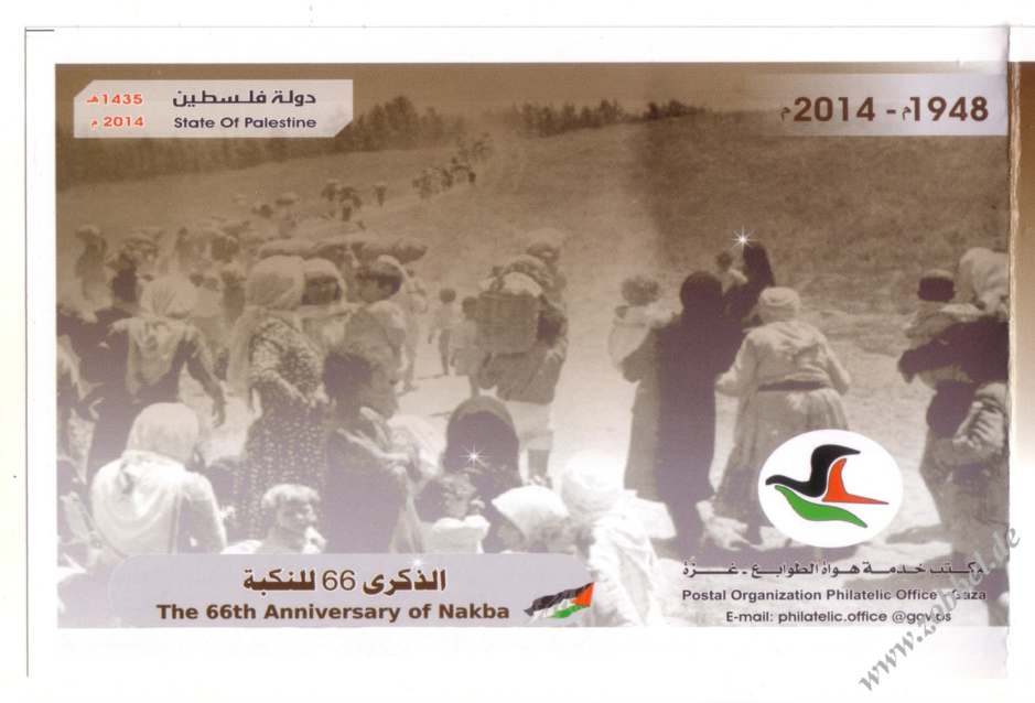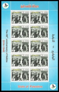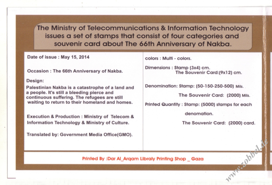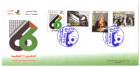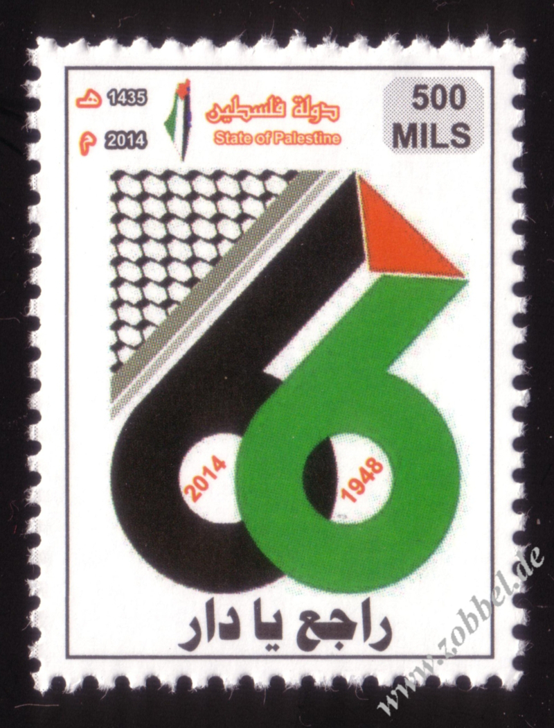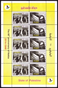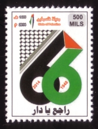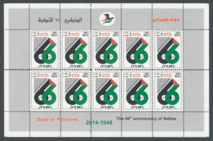 According to reports, the Ministry of Telecom & Information Technology in Gaza has issued in November 2014 a series of stamps under slogan "66th Anniversary of Nakba". It consists of 4 stamps denominated at 50, 150, 250, and 500 Mils, and one block denominated at 2,000 Mils.