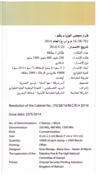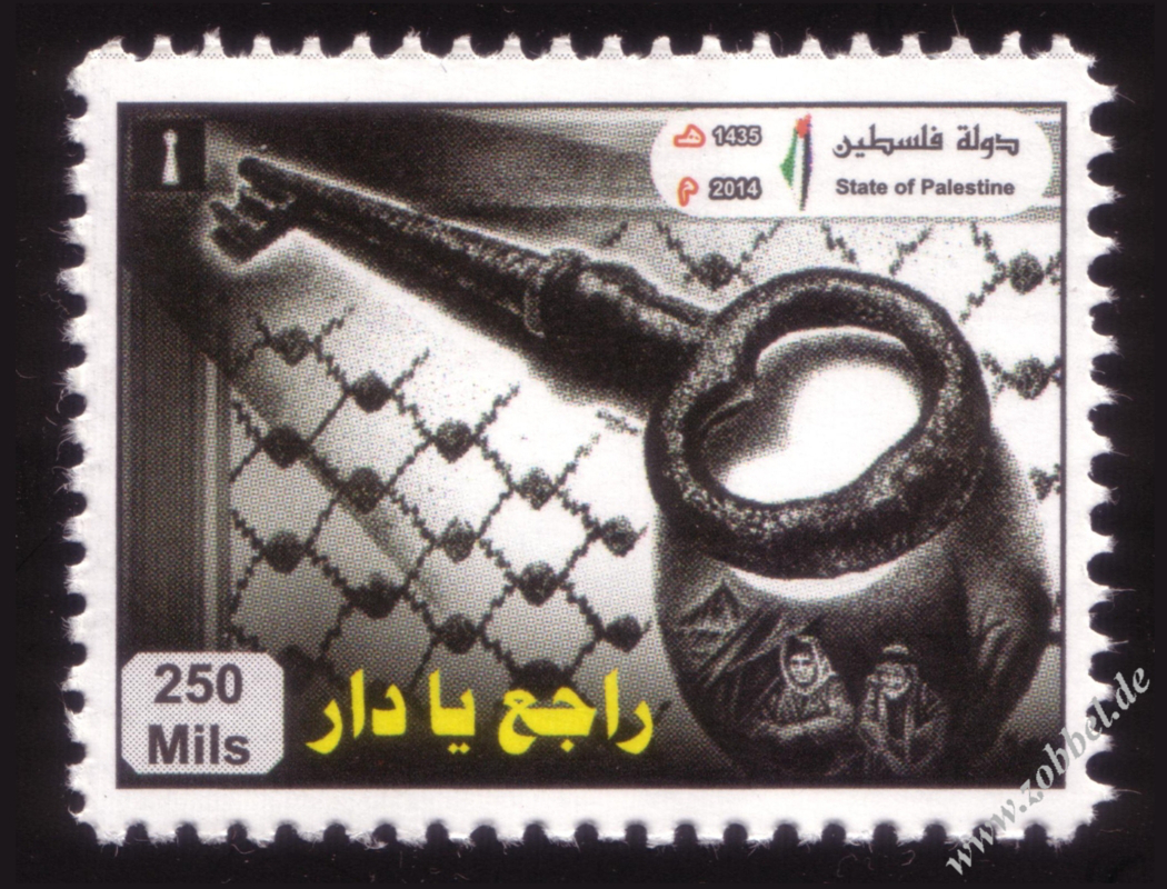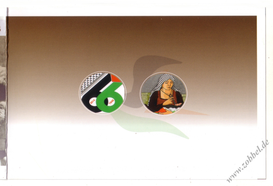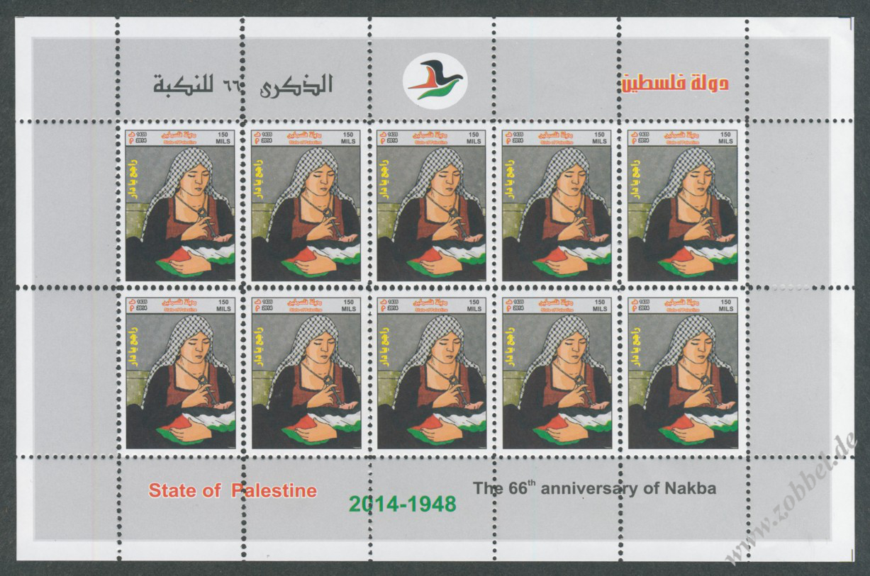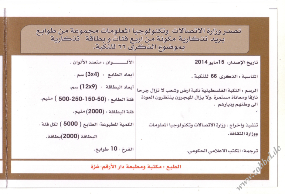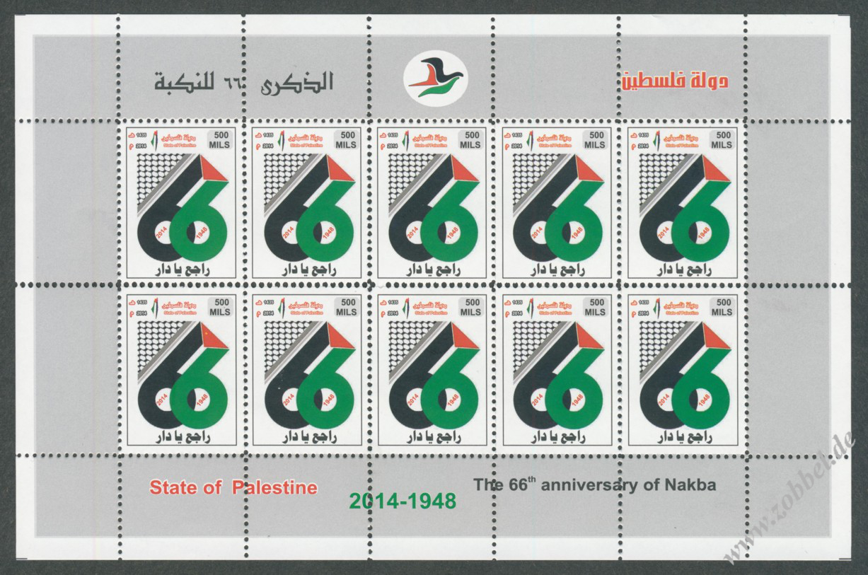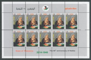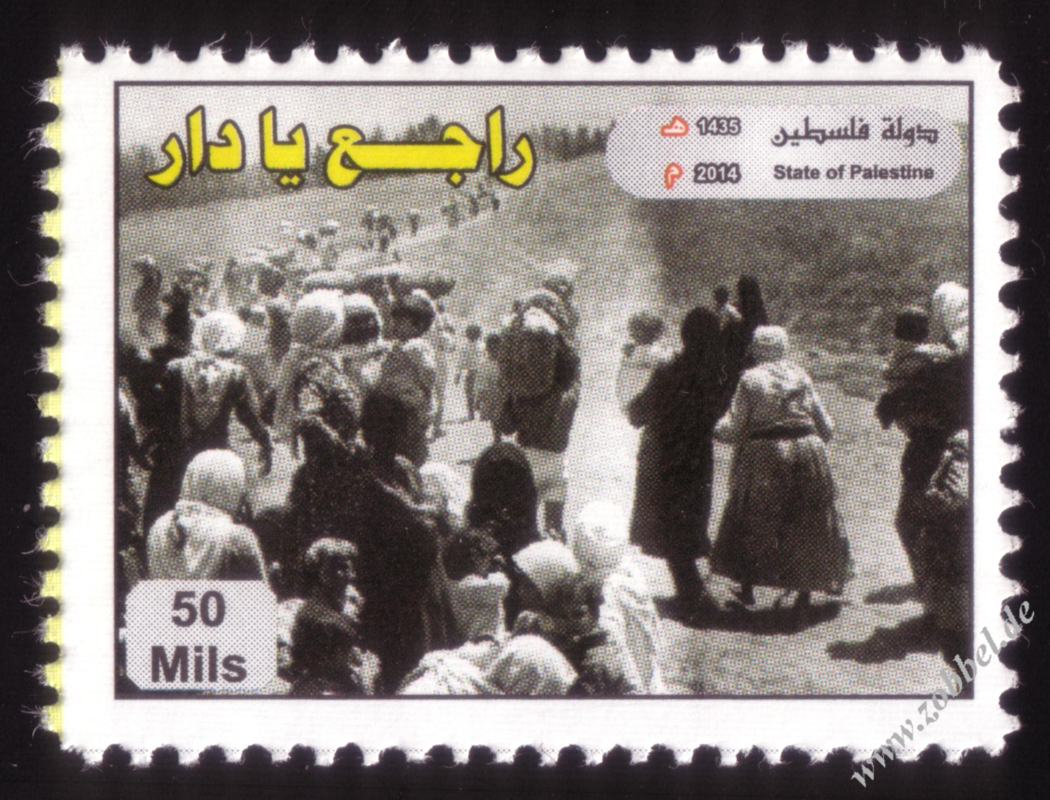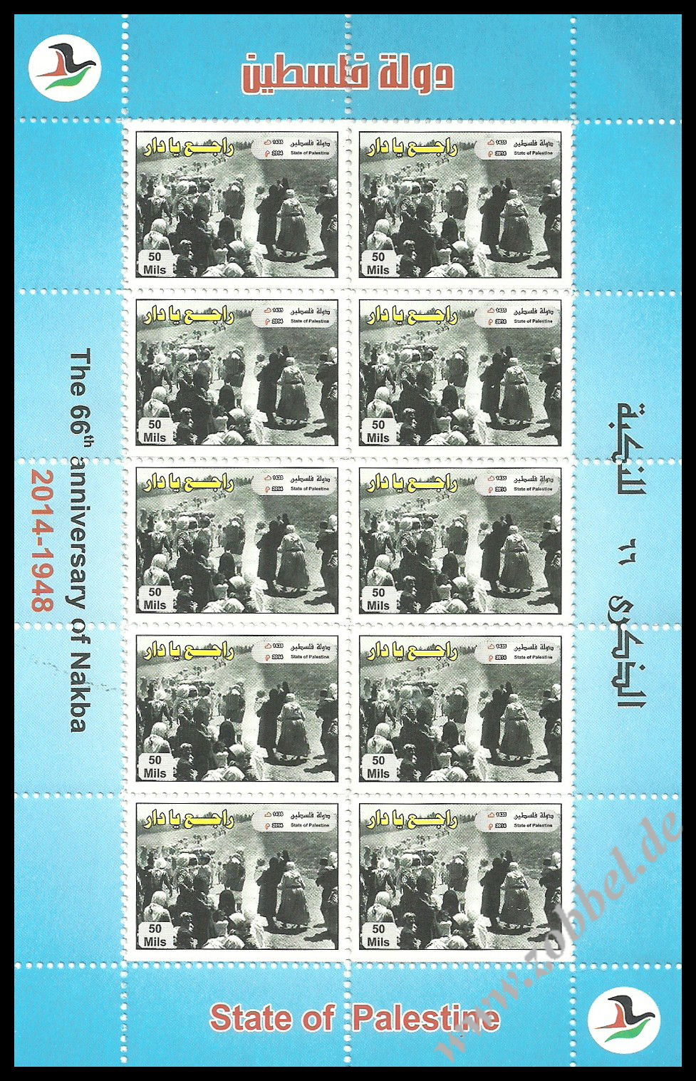 According to reports, the Ministry of Telecom & Information Technology in Gaza has issued in November 2014 a series of stamps under slogan "66th Anniversary of Nakba". It consists of 4 stamps denominated at 50, 150, 250, and 500 Mils, and one block denominated at 2,000 Mils.