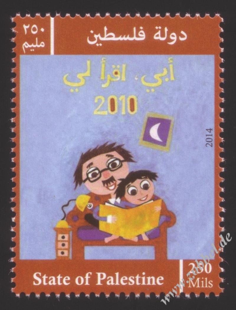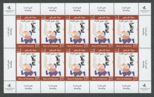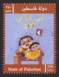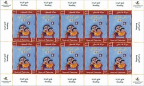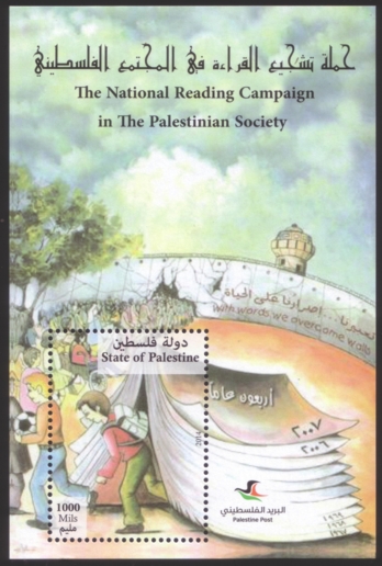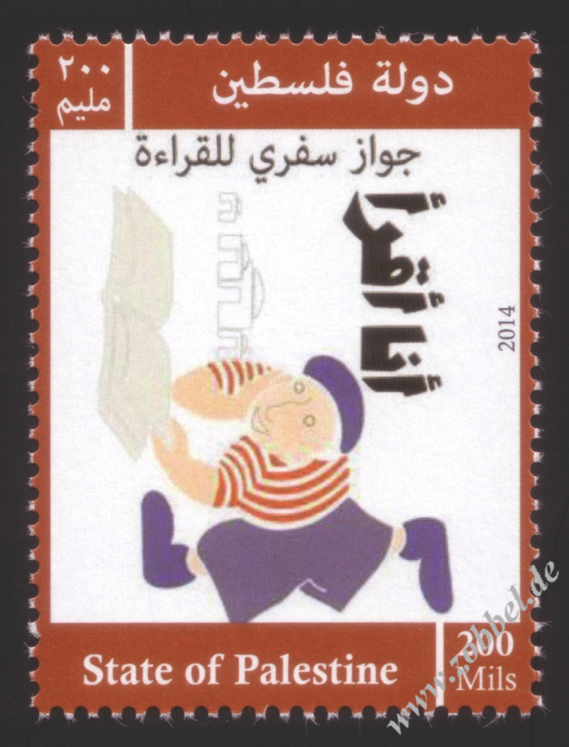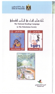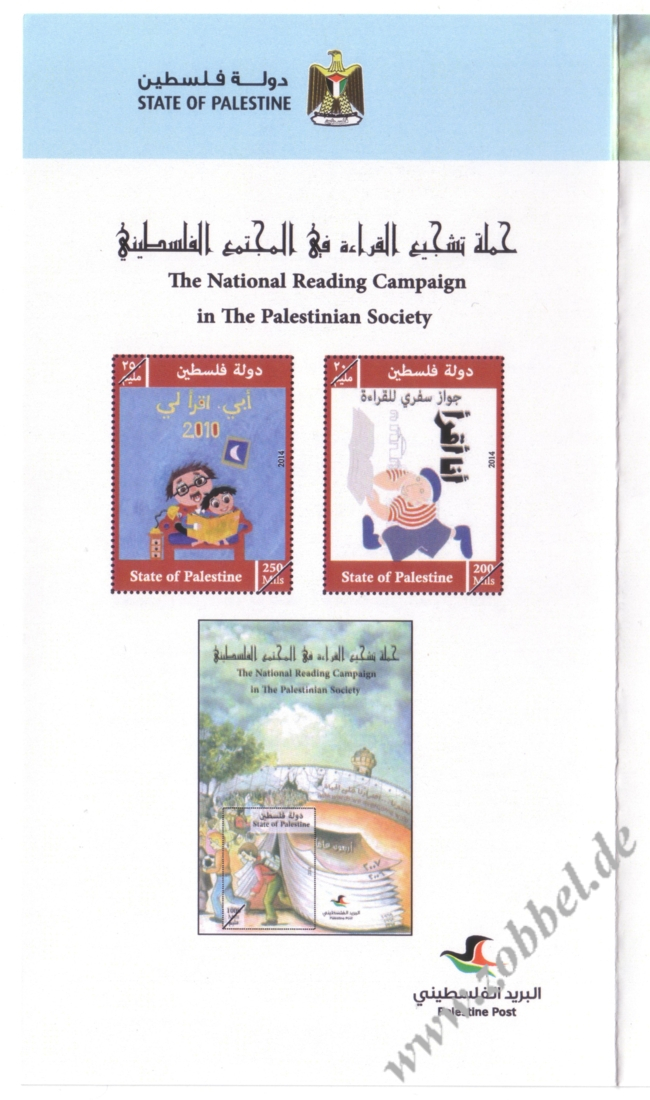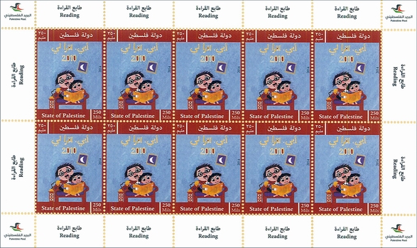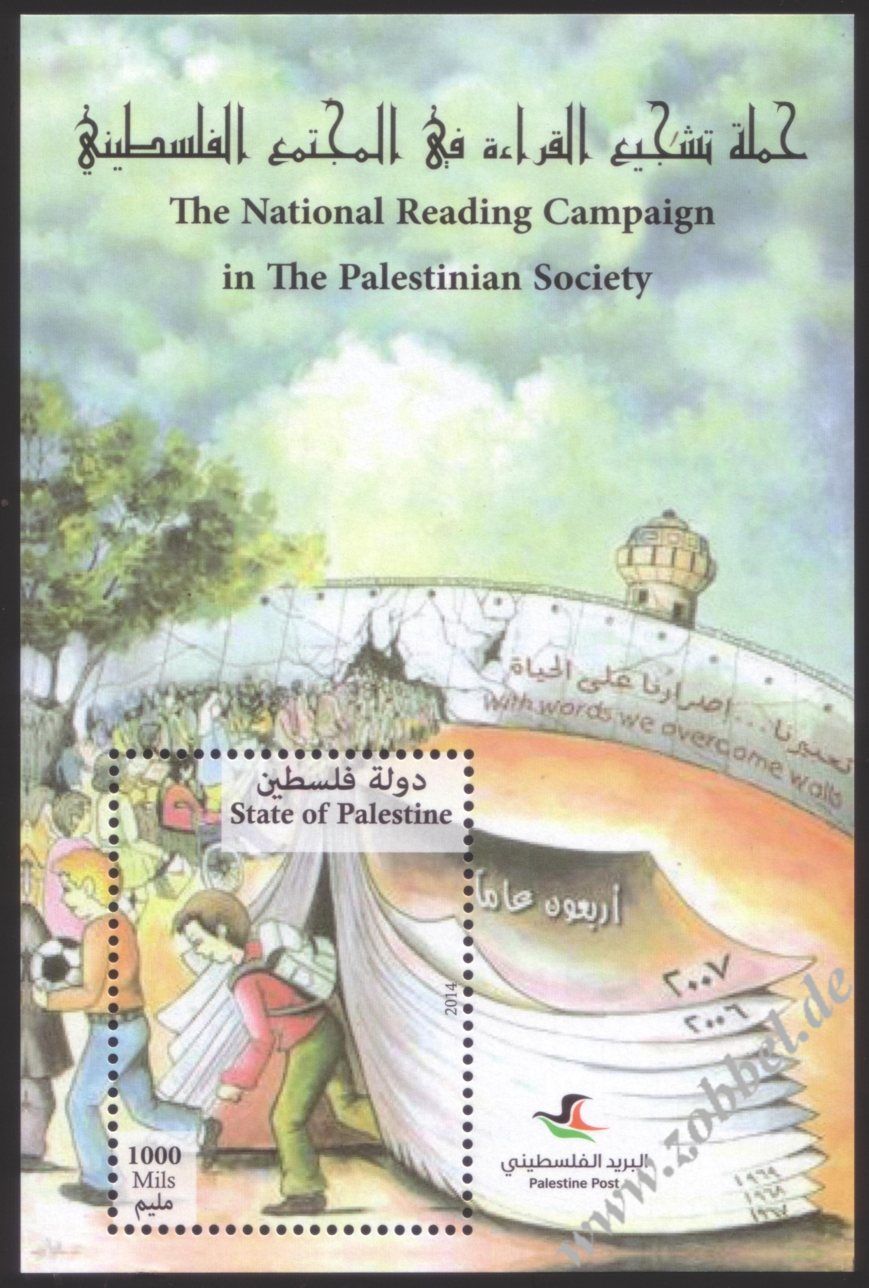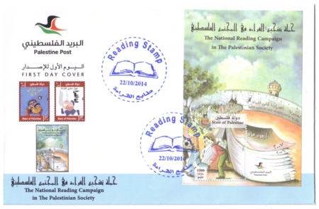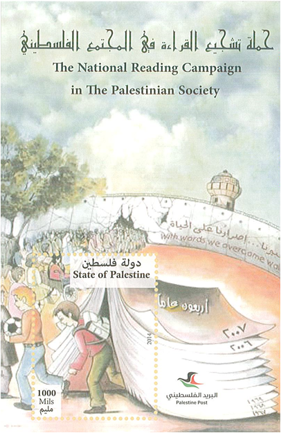 According to reports, Palestine Post has, in collaboration with the Tamer Institute for Community Education, released on 22.10.2014 a stamp series on the topic of "The National Reading Campaign in the Palestinian Society" conisting of two stamps and one block. The stamps were designed by Anas Maraqa based on children's paintings (by Tamer Mousa & Nadina Sudani), the block on a TAMER poster. Denominations are: 200 and 250 Mils (stamps), and 1,000 Mils (block). Printed in offset by Oriental Security Printing Solution, Bahrain in sheets of 10 (5x2): 10,000 stamps each and 3,000 blocks.