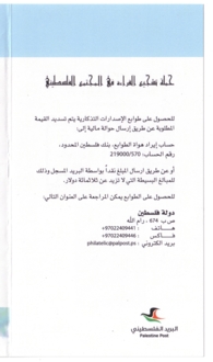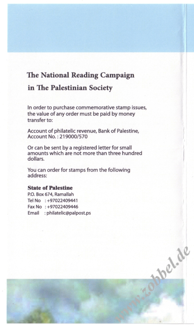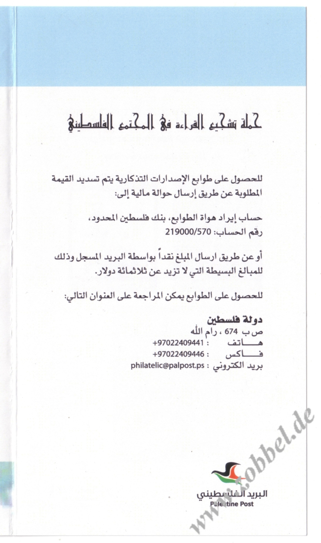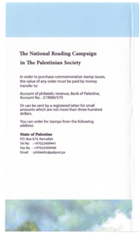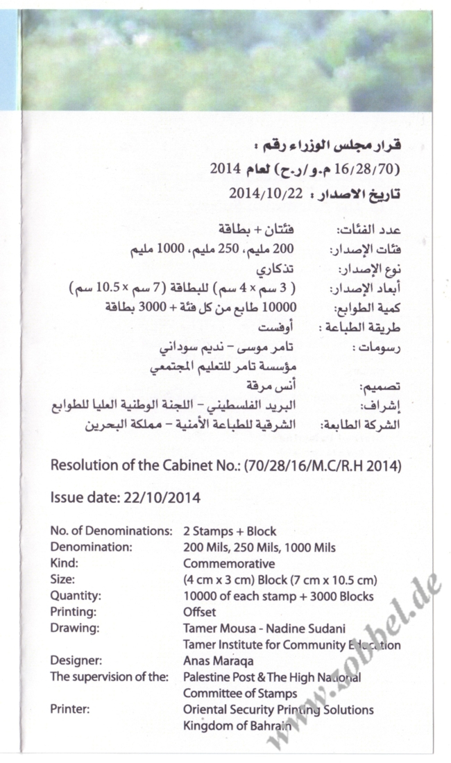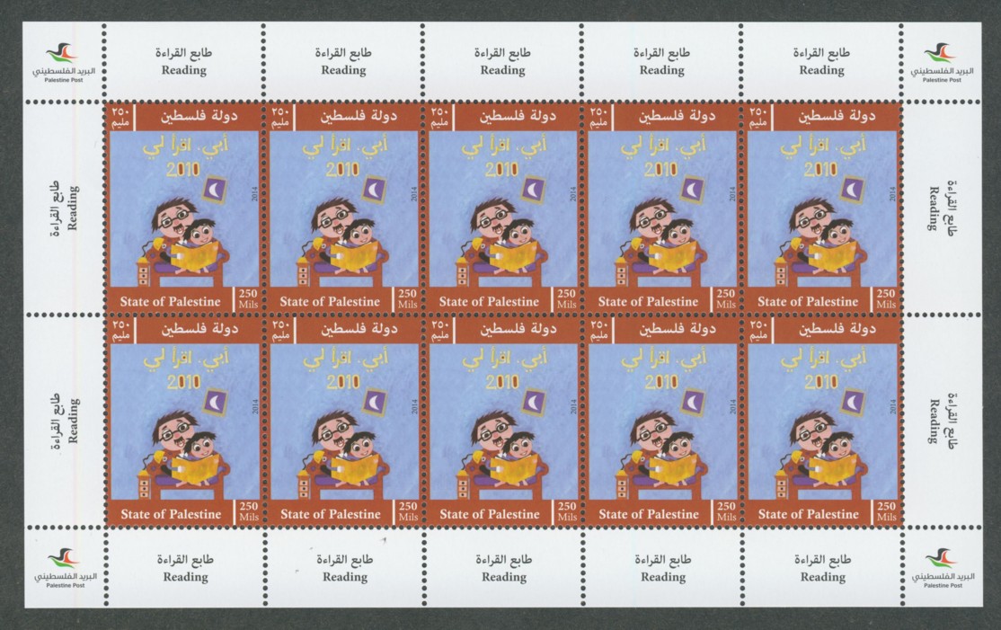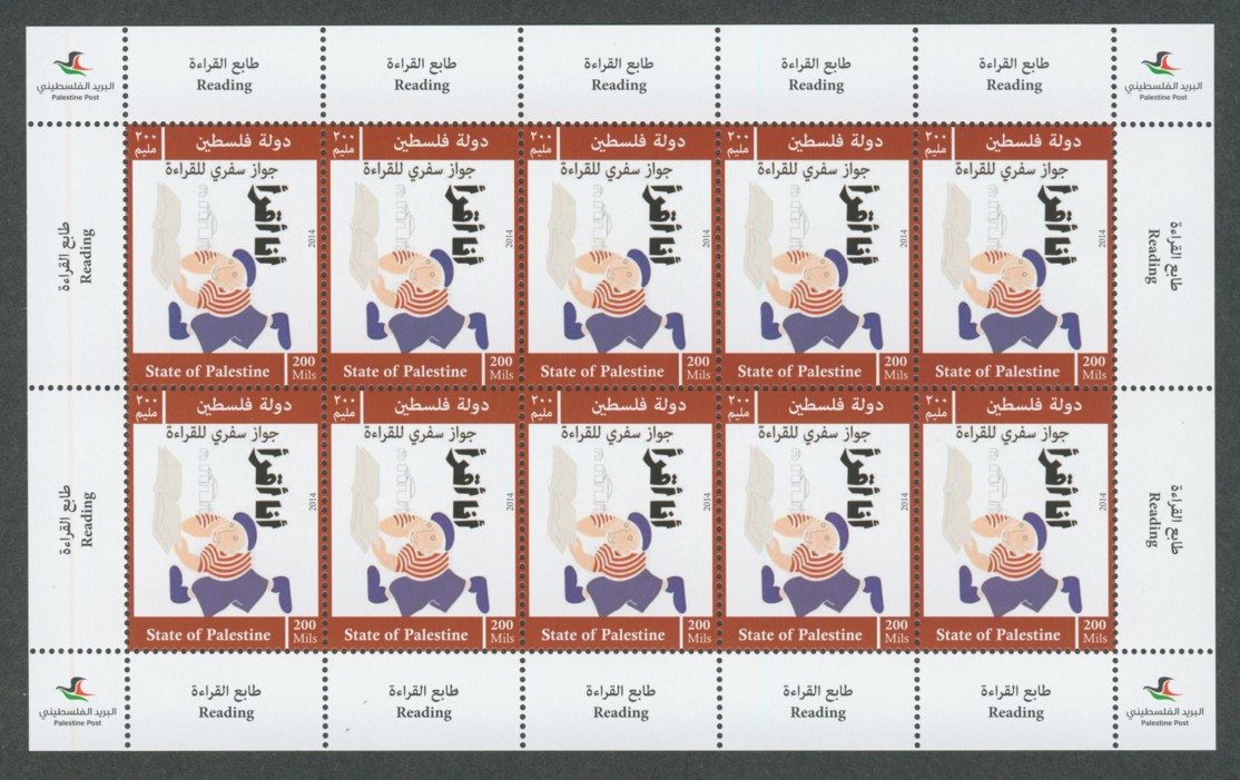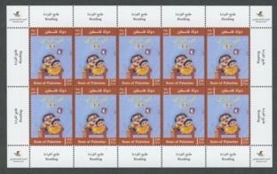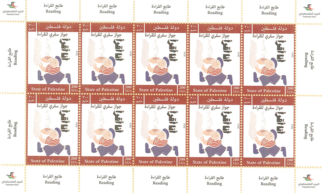 According to reports, Palestine Post has, in collaboration with the Tamer Institute for Community Education, released on 22.10.2014 a stamp series on the topic of "The National Reading Campaign in the Palestinian Society" conisting of two stamps and one block. The stamps were designed by Anas Maraqa based on children's paintings (by Tamer Mousa & Nadina Sudani), the block on a TAMER poster. Denominations are: 200 and 250 Mils (stamps), and 1,000 Mils (block). Printed in offset by Oriental Security Printing Solution, Bahrain in sheets of 10 (5x2): 10,000 stamps each and 3,000 blocks.