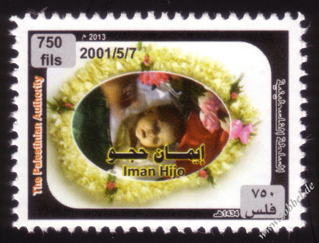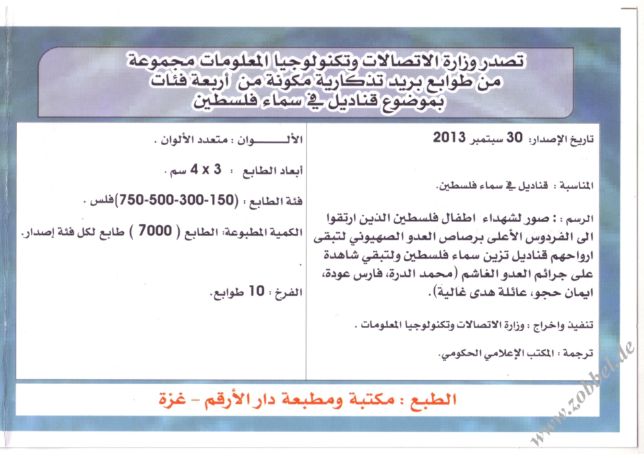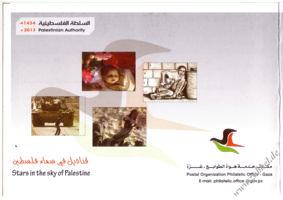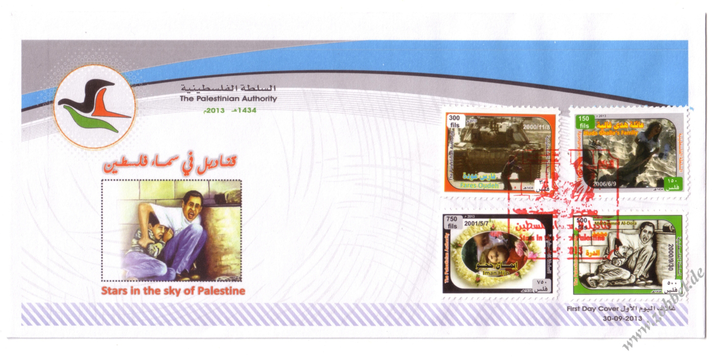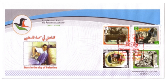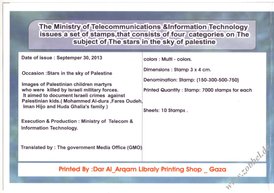According to reports the Gaza Ministry has issued during March 2014 a set of stamps depicting child martyrs under the title "Stars in the Sky of Palestine". The four stamps are denominated at 150, 300, 500, and 750 Fils. 7,000 copies each were printed by Dar al-Arqam Library Printing Shop in Gaza in sheets of 10 (2x5). The series was originally planned for September 2013, and the FDC shows a postmark dated 30.09.2013. Depicted are: