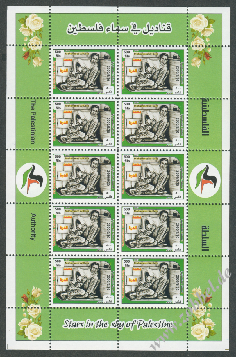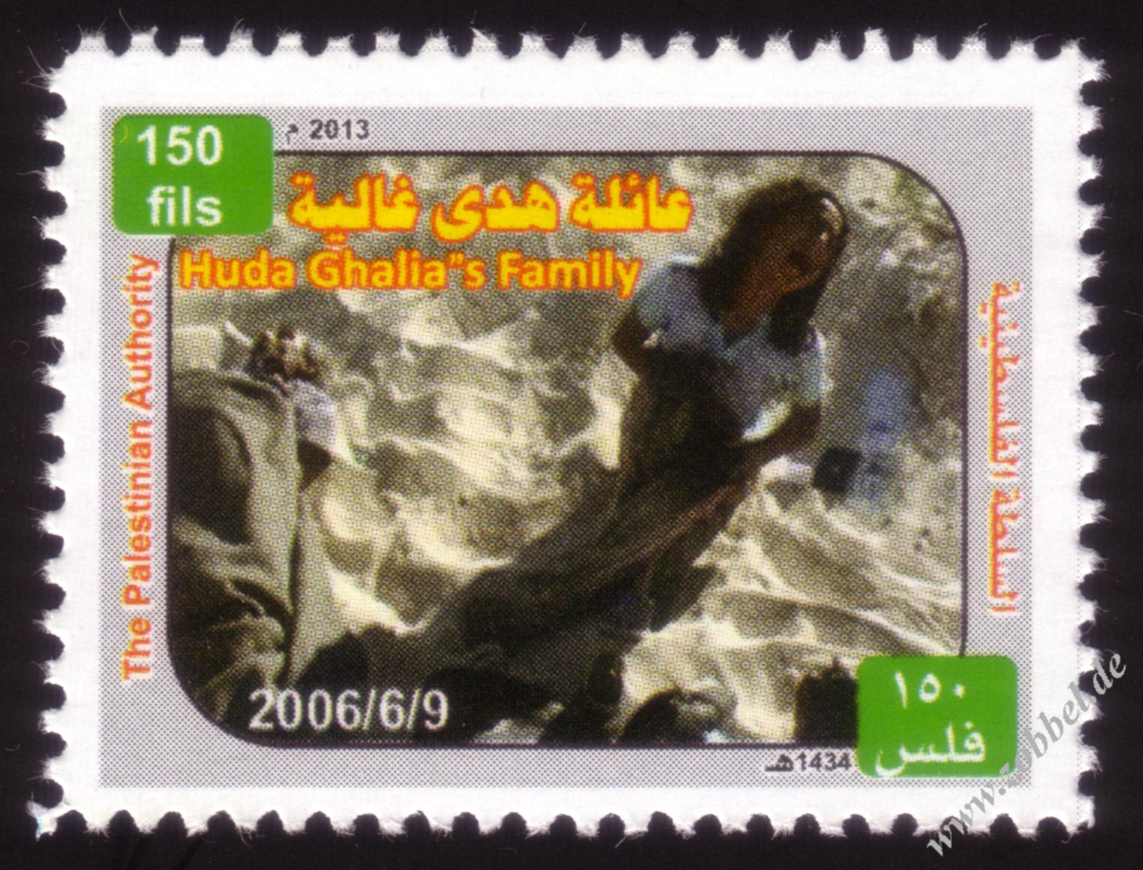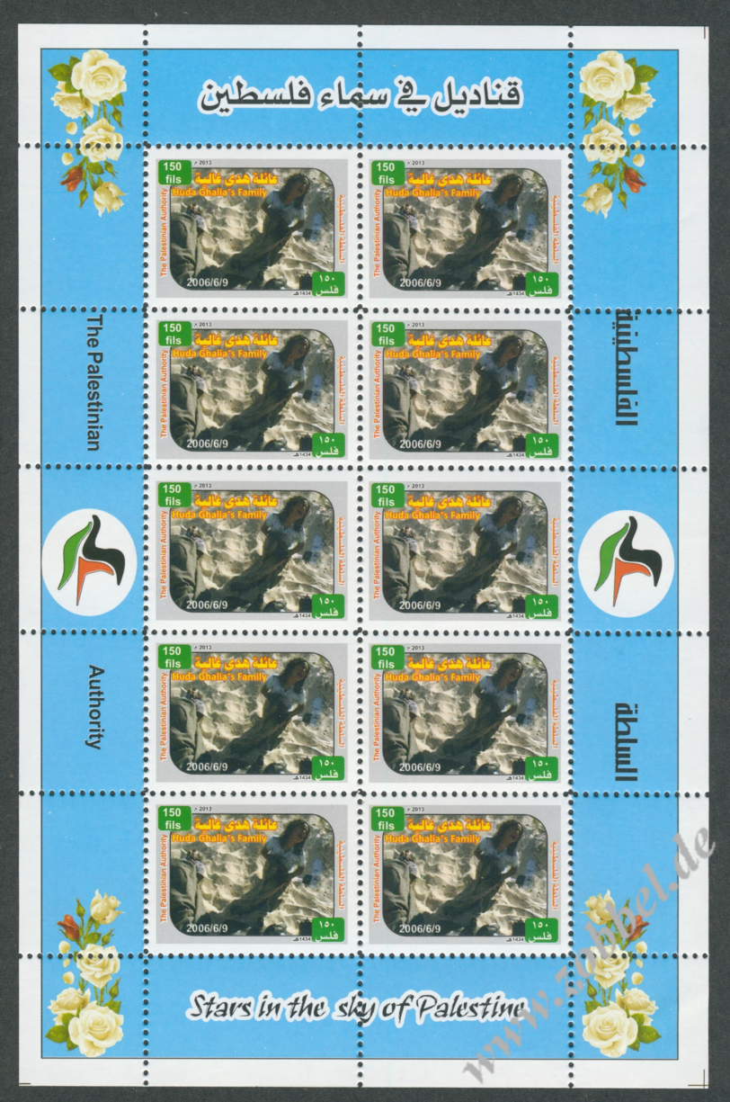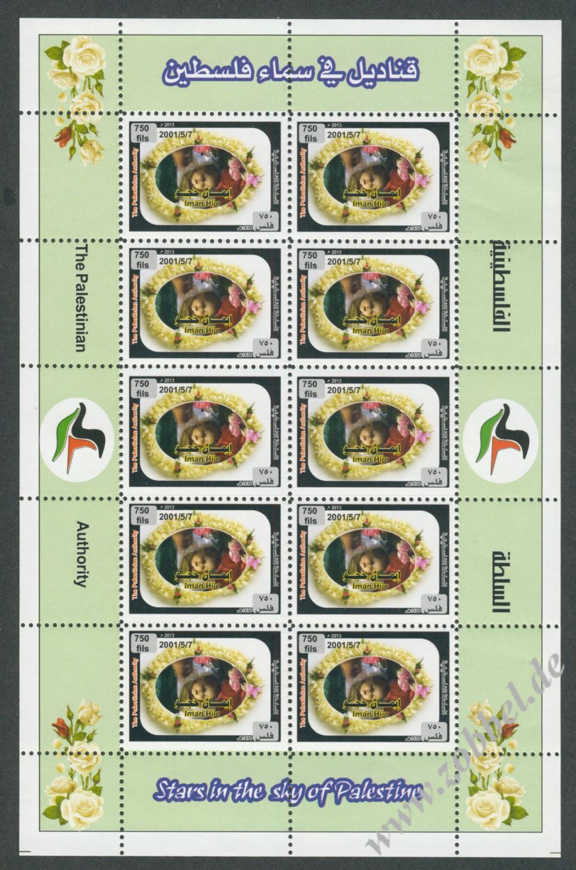 According to reports the Gaza Ministry has issued during March 2014 a set of stamps depicting child martyrs under the title "Stars in the Sky of Palestine". The four stamps are denominated at 150, 300, 500, and 750 Fils. 7,000 copies each were printed by Dar al-Arqam Library Printing Shop in Gaza in sheets of 10 (2x5). The series was originally planned for September 2013, and the FDC shows a postmark dated 30.09.2013. Depicted are: