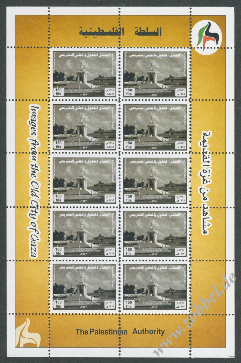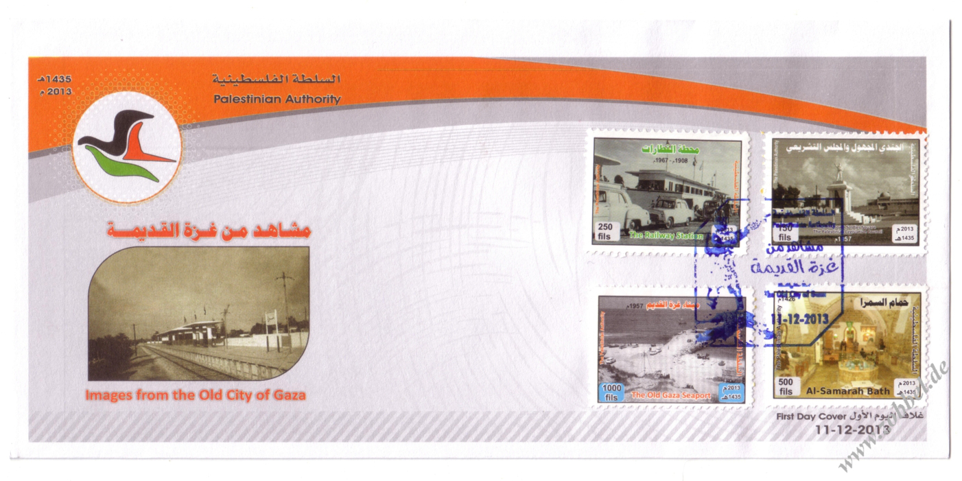 According to reports the Gaza Ministry has issued during March 2014 a set of stamps depicting buildings and monuments in Gaza under the title "Old Gaza Landmarks". The four stamps are denominated at 150, 250, 500, and 1,000 Fils. 7,000 (?) copies each were printed by Dar al-Arqam Library Printing Shop in Gaza in sheets of 10 (2x5). The series was originally planned for December 2013, and the FDC shows a postmark dated 11.12.2013. Depicted are: