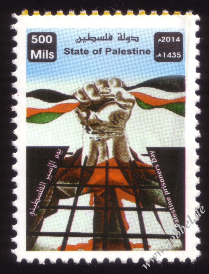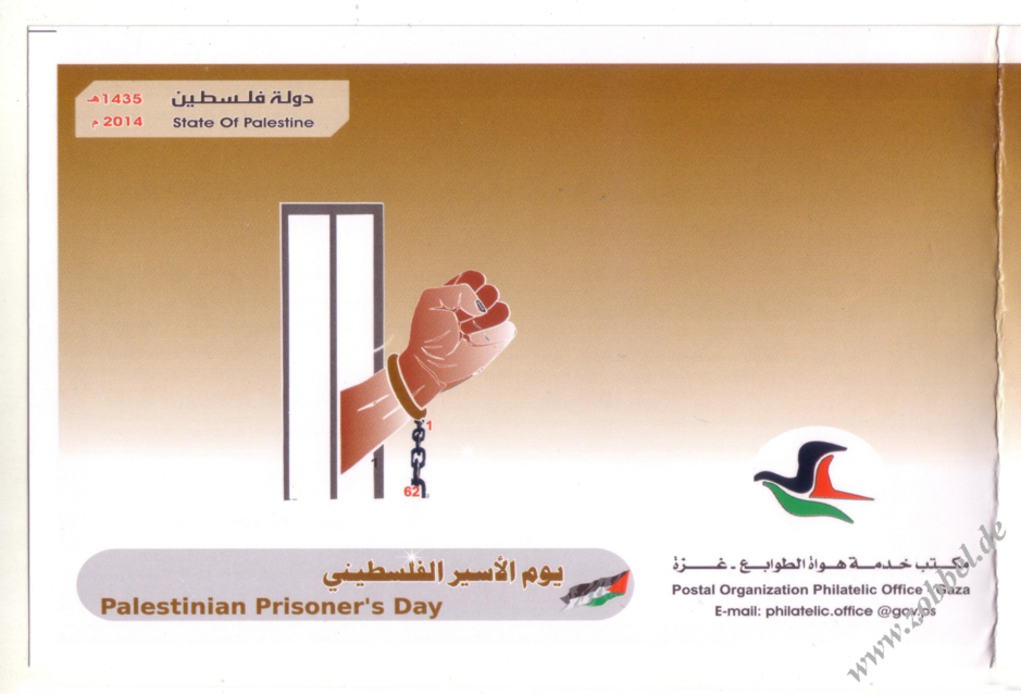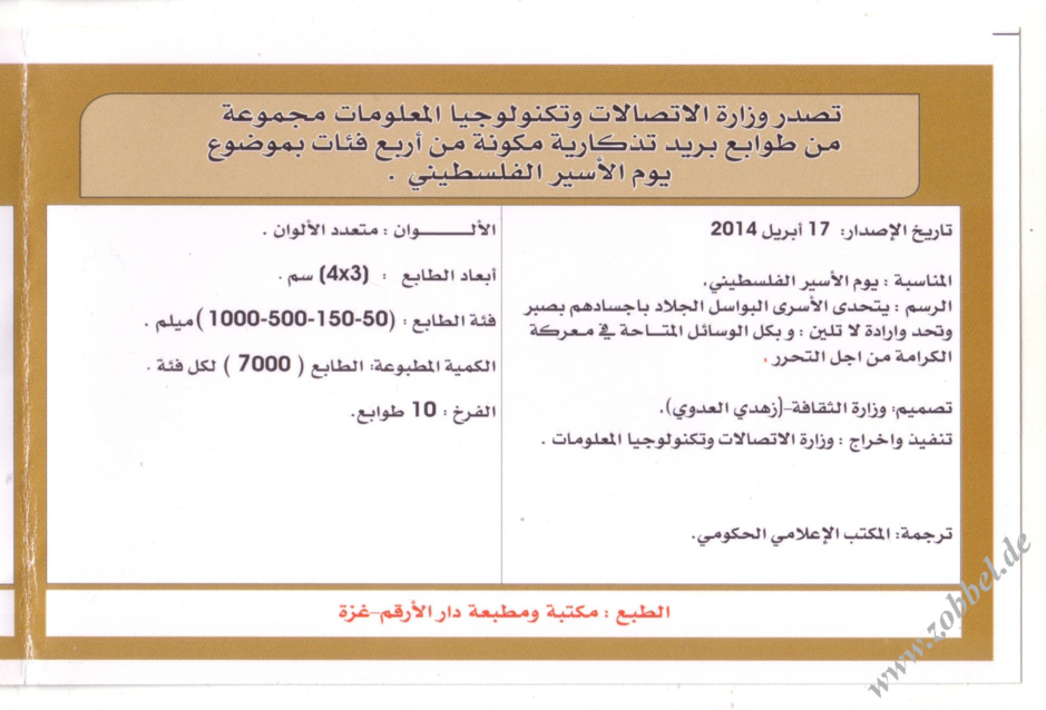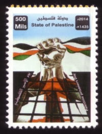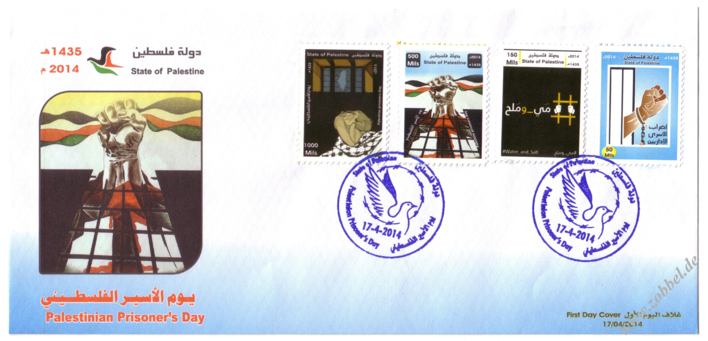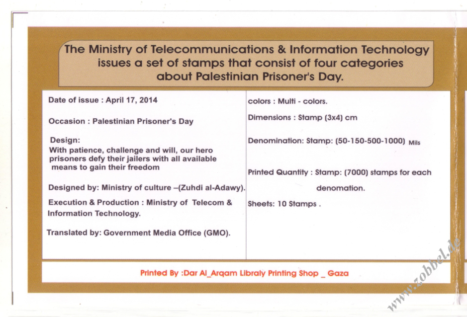 According to reports, the Ministry of Telecom & Information Technology in Gaza has issued in November 2014 a series of stamps under slogan "Palestinian Prisoner's Day". It consists of 4 stamps denominated at 50, 150, 500, and 1,000 Mils, printed in sheets of ten (5x2). Designer: Zuhdi al-Adawy (Ministry of Culture). 7,000 stamps of each value were printed locally by Dar al-Arqam Library Printing Shop, Remal. The nominal issue date is 17.04.2014, the actual Palestinian Prisoner's Day (postmark on FDC).