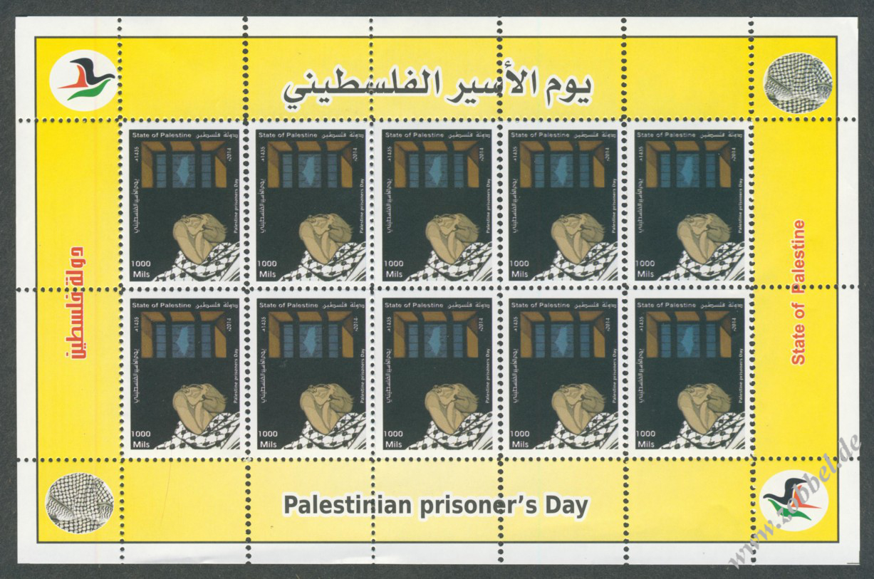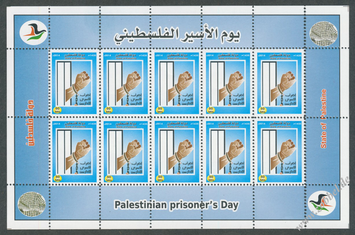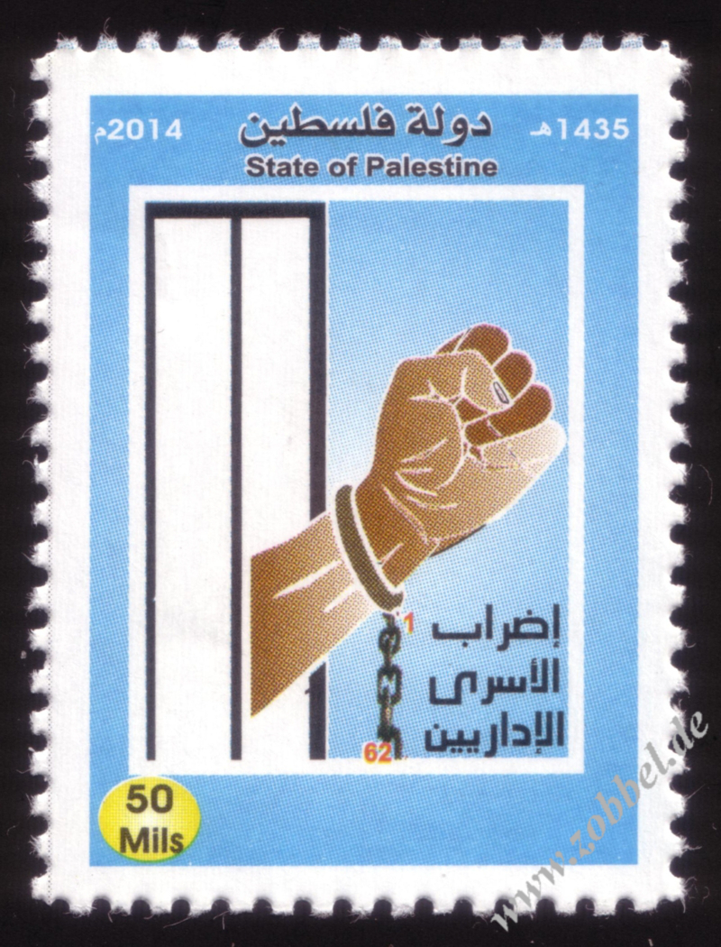 According to reports, the Ministry of Telecom & Information Technology in Gaza has issued in November 2014 a series of stamps under slogan "Palestinian Prisoner's Day". It consists of 4 stamps denominated at 50, 150, 500, and 1,000 Mils, printed in sheets of ten (5x2). Designer: Zuhdi al-Adawy (Ministry of Culture). 7,000 stamps of each value were printed locally by Dar al-Arqam Library Printing Shop, Remal. The nominal issue date is 17.04.2014, the actual Palestinian Prisoner's Day (postmark on FDC).