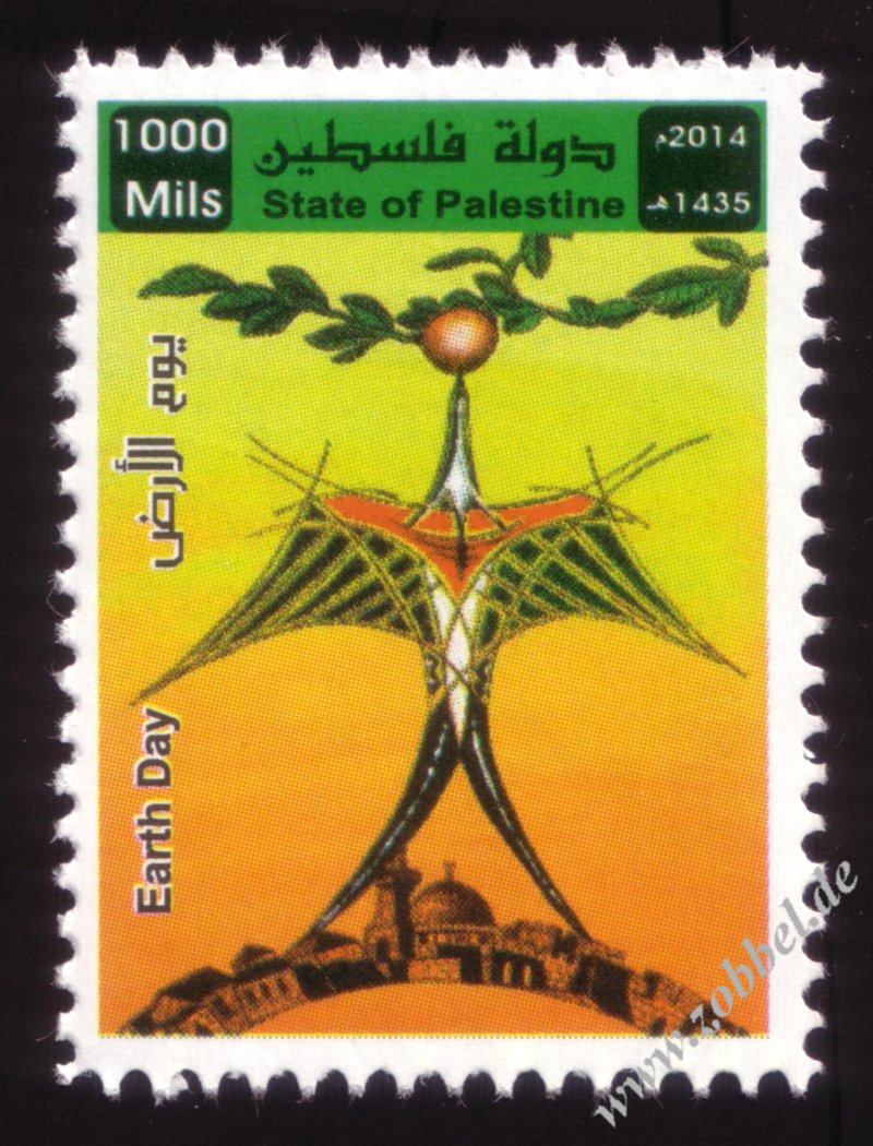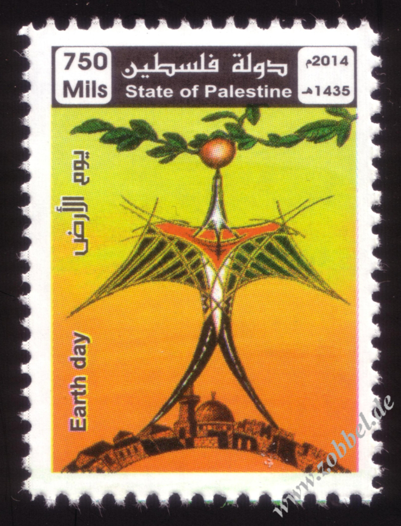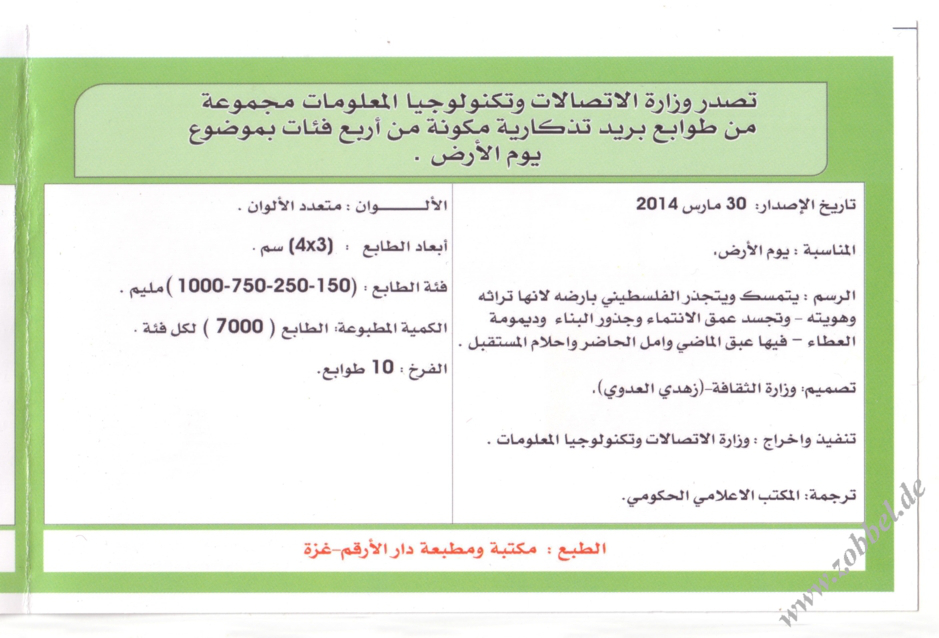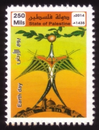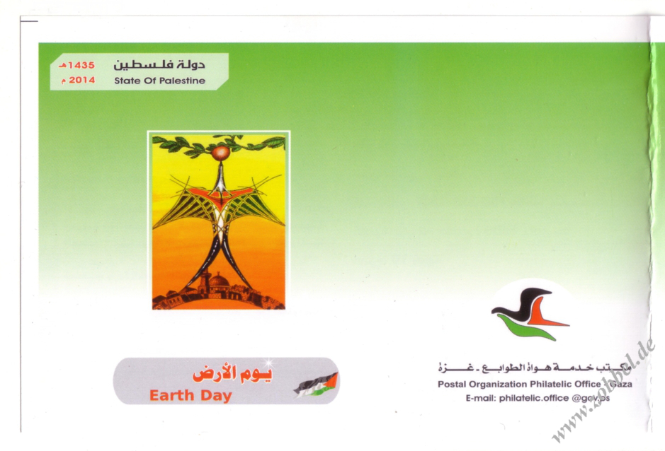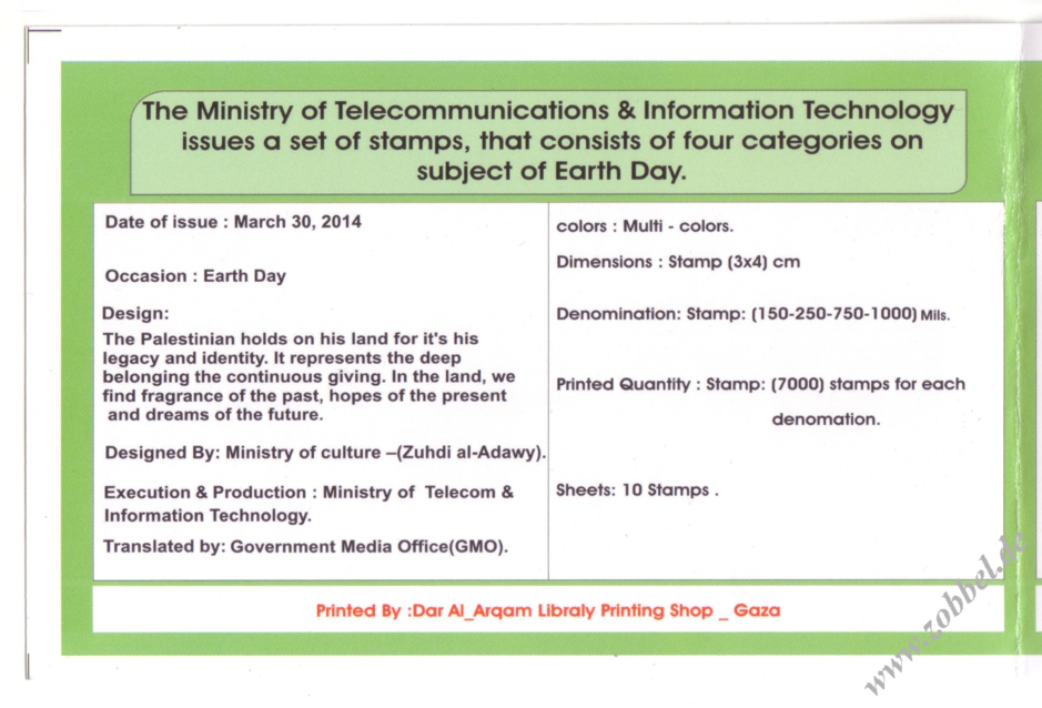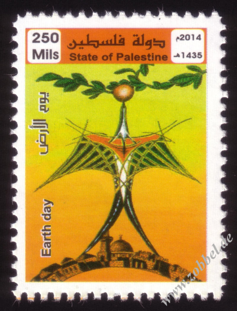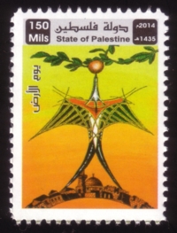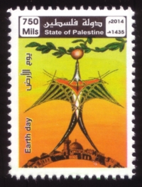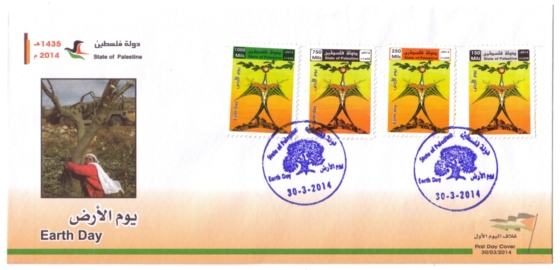 According to reports, the Ministry of Telecom & Information Technology in Gaza has issued in November 2014 a series of stamps under slogan "Earth Day" commemorating the annual Palestine Land Day (يوم الأرض) on 30th March. It consists of 4 stamps denominated at 150, 250, 750 and 1,000 Mils. Designer: Zuhi al-Adawy (Ministry of Culture). 7,000 stamps of each value were printed locally by Dar al-Arqam Library Printing Shop, Remal. The nominal issue date is 17.04.2014 (postmark on FDC).