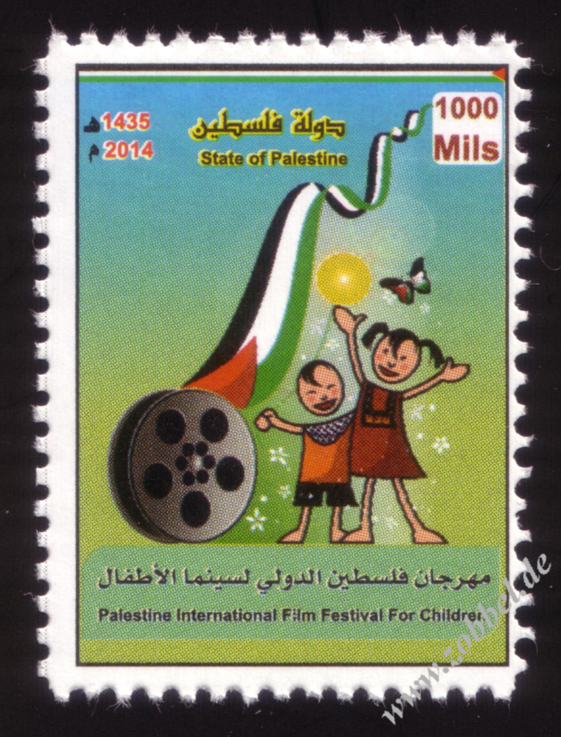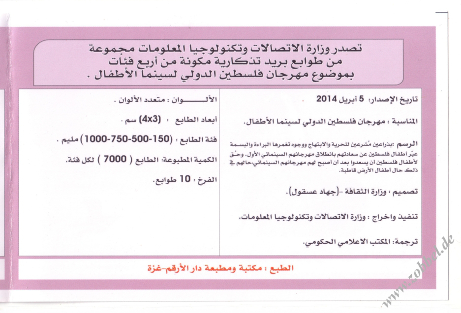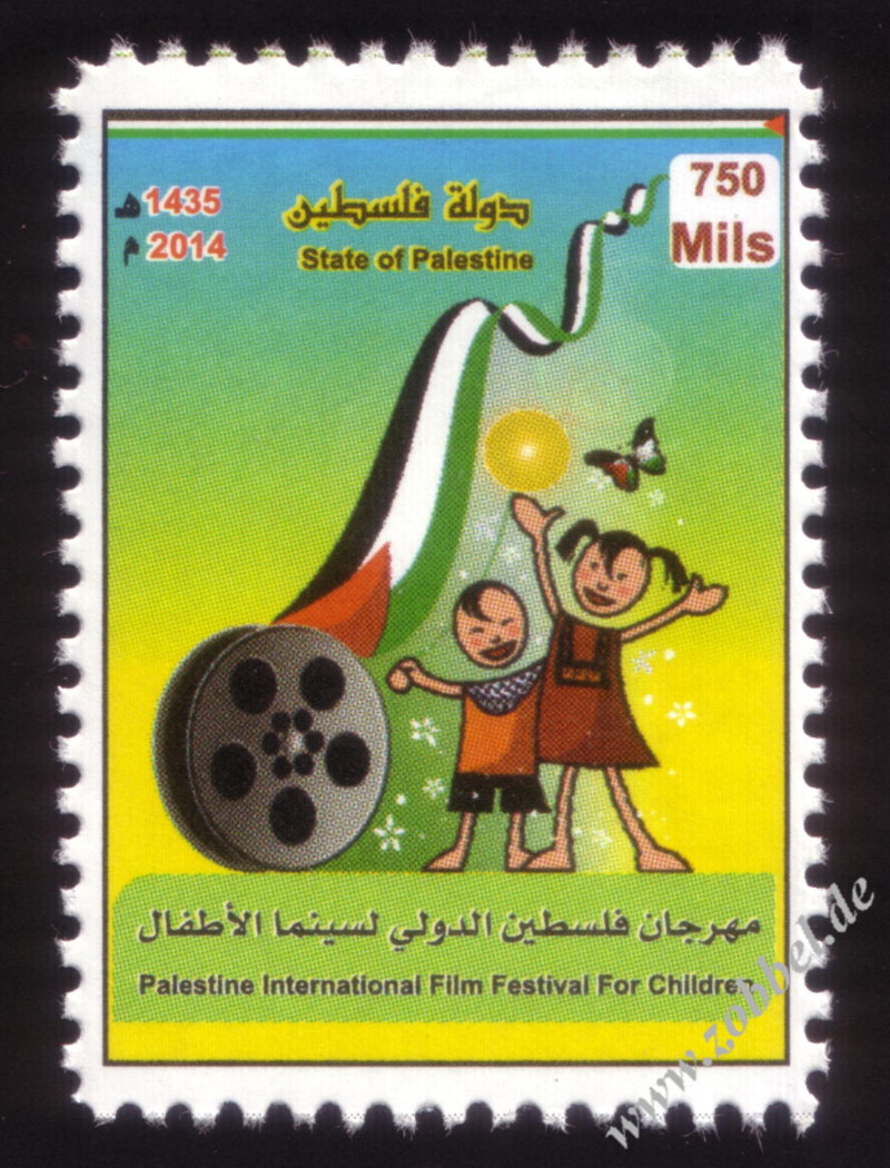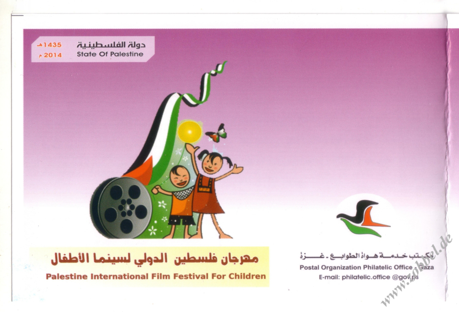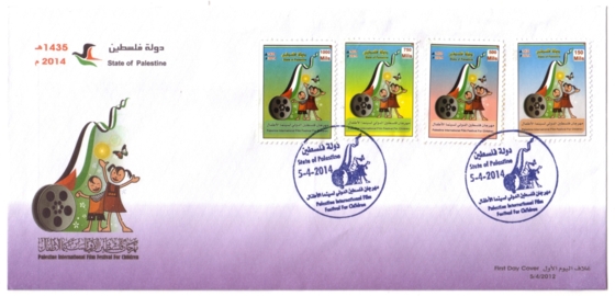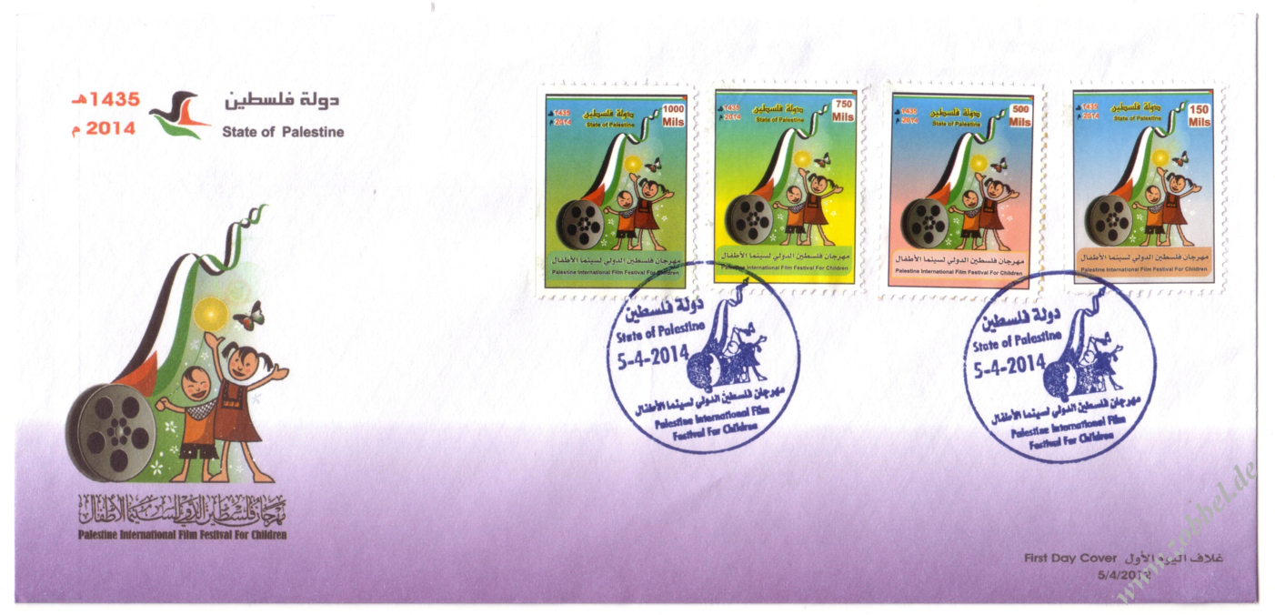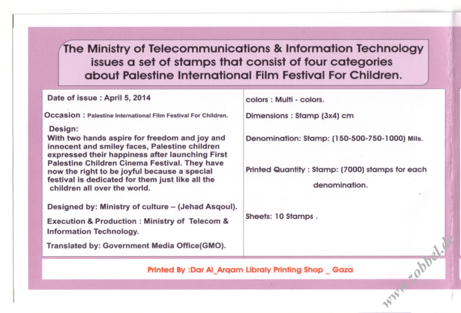 According to reports, the Ministry of Telecom & Information Technology in Gaza has issued in November 2014 a series of stamps under slogan "The Palestine International Film Festival for Children" (مهرجان فلسطين الدولي لسينما الأطفال). The festival was originally planned for 16-20.06.2013, but took place 20-23.11.2013 at the Holst Park & Cultural Centre in Toffah, Gaza. The stamp series consists of 4 stamps denominated at 150, 500, 750, and 1,000 Mils, printed in shhets of ten (5x2). Designd by Jehad Asqoul (Ministry of Culture) and printed locally (7,000 of each value) by Dar al-Arqam Library Printing Shop, Remal. The nominal issue date is 5.04.2014 (postmark on FDC).