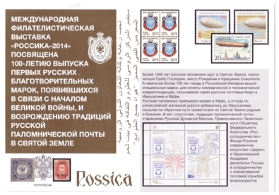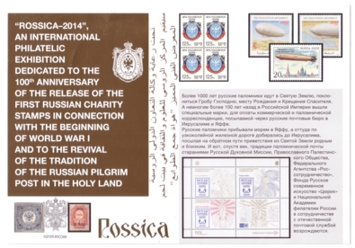 On April 26, a philatelic exhibition was opened with the support of the Russian National Academy of Philately, the Palestinian Ministry of Culture and the Palestinian Ministry of Communications and Information at the Russian Centre of Science and Culture in Bethlehem. The exhibition was dedicated both to the 100th anniversary of the first Russian charity stamps which appeared in connection with the outbreak of the First World War, and to the revival of the tradition of Russian pilgrimages in the Holy Land. The event began with welcoming speeches given by the director of the Russian Center for Science and Culture in Bethlehem Sergei Shapovalov, the Palestinian Director-General for Heritage Yousef Al-Tarturi, the Director-General of Palestine Post Fathi Abu Shbak, representative of the Palestinian Association of Philatelists Faek Mizied, the President of the Russian National Academy of Philately Andrew Strygina, and by the chairman of the Board of Trustees of the Academy, Honoured Architect of Russia, Sergey Tkachenko. In the course of the exhibition, cards and vignettes of the pilgrims post were stamped in an official ceremony with a postmark designed especially for this event. At the end of the official part, diplomas and certificates were awarded to participants and organizers of the exhibition, which is of particular importance for philatelists in Russia and Palestine, as this year marks the 20th anniversary of Palestinian pilgrimage mail. The event was attended by representatives of the Ministry of Culture of Palestine, Ministry of Communications and Information of Palestine, by the President and members of the Russian National Academy of Philately, representatives of the Coordinating Council of Russian compatriots residing in the territory of Palestine, the Alumni Association of Russian-speaking universities and many others for whom the stamps are not just collectibles, but also part of the cultural heritage of both Russia and Palestine. The opening was covered by state owned and private mass media, after the tour of the exhibition the Russian philatelists gave interviews to the local media. Source: Международная филателистическая выставка |