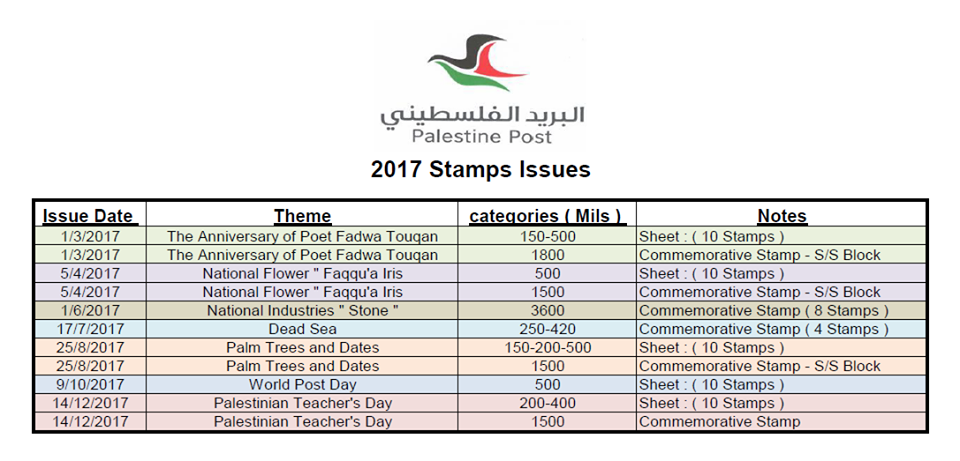 The West Bank government's Palestine Post in Ramallah/al-Bireh is to issue these series of stamps during 2017: The ministry in Gaza, under nominal control of the Unity Government, has issued these series of stamps:
