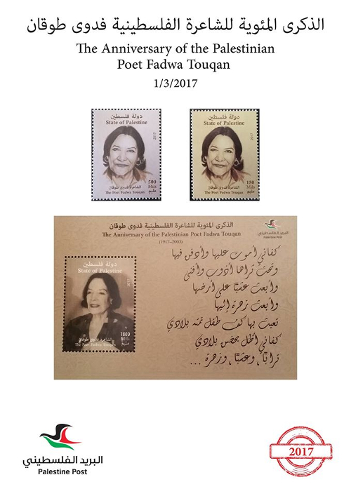 100th Anniversary of Fadwa TouqanAccording to reports, Palestine Post has issued on 14.01.2017 a set of stamps commemoratring the 100the anniversary of the birth of poet Fadwa Touqan (فدوى طوقان). She was born in Nablus 1.03.1917, and died 12.12.2003. The two stamps are denominated at 150 and 500 Mils, and a block at 1,800 Mils. [further information to be added as soon as available]