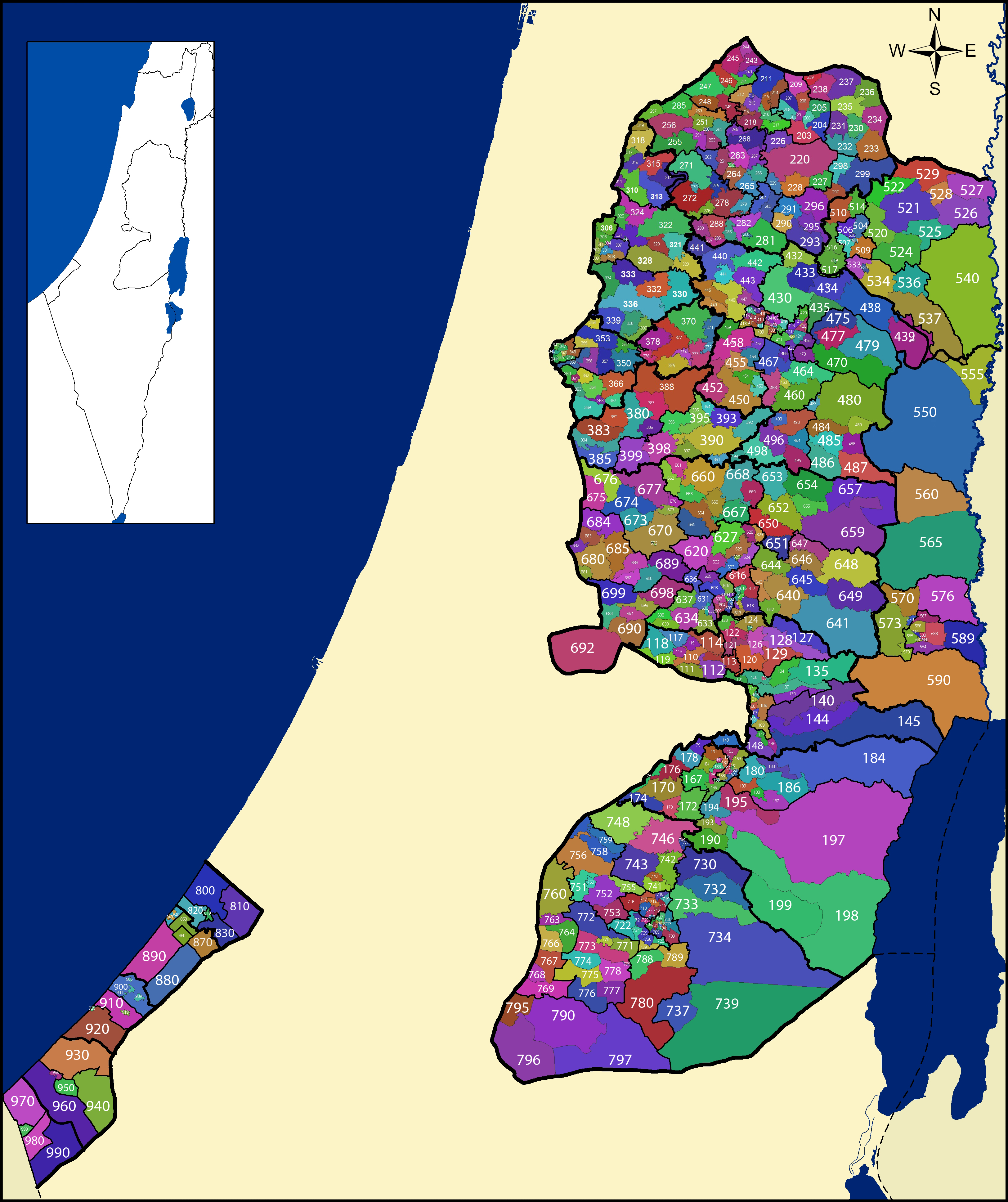 Karte sowie Listen mit Postleitzahlgebieten. Ab Juni 2011 wurden die aktuellen Version via Datanbank und detaillieren Karten veröffentlicht: "Postal coding system in Palestine" und Zinnar Address Server.