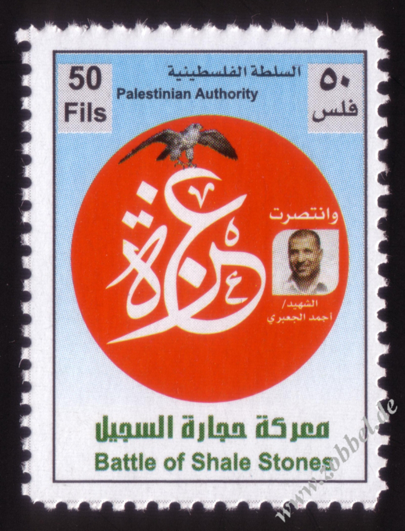 According to reports, the Hamas-controlled Ministry of Telecom & Information Technology in Gaza has issued on 5.06.2013 a stamp series under the slogan "Battle of Shale Stones & Martyr Ahmed Jabari". It consists of six stamps (50, 150, 250, 500, 750, 1000 Fils) and one block (3000 Fils). The design can be attributed to Johaa Toon Co. and the block is printed locally by Dar al-Arqam Library Printing Shop, Remal. Prinruns: 20,000 of each stamp, and 3,000 for the block. The nominal issue date is 12.12.2012 (postmark on FDC).